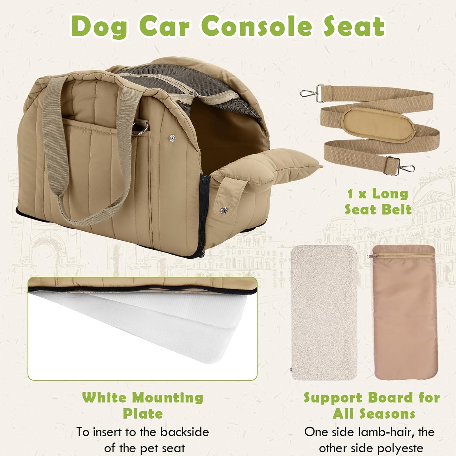 - Fashion & Portable Design - The center console pet car seat designed with two durable weaving handles for carrying by hand, and a long weaving straps for carrying by one shoulder or carry crossbody. The pet carrier is designed with Top Breathable Mesh Net, once closed the net, no worry about pets’ slip away; roll it up to allow pets stick their heads out. It fits for most standard car seats, vans, SUVS.