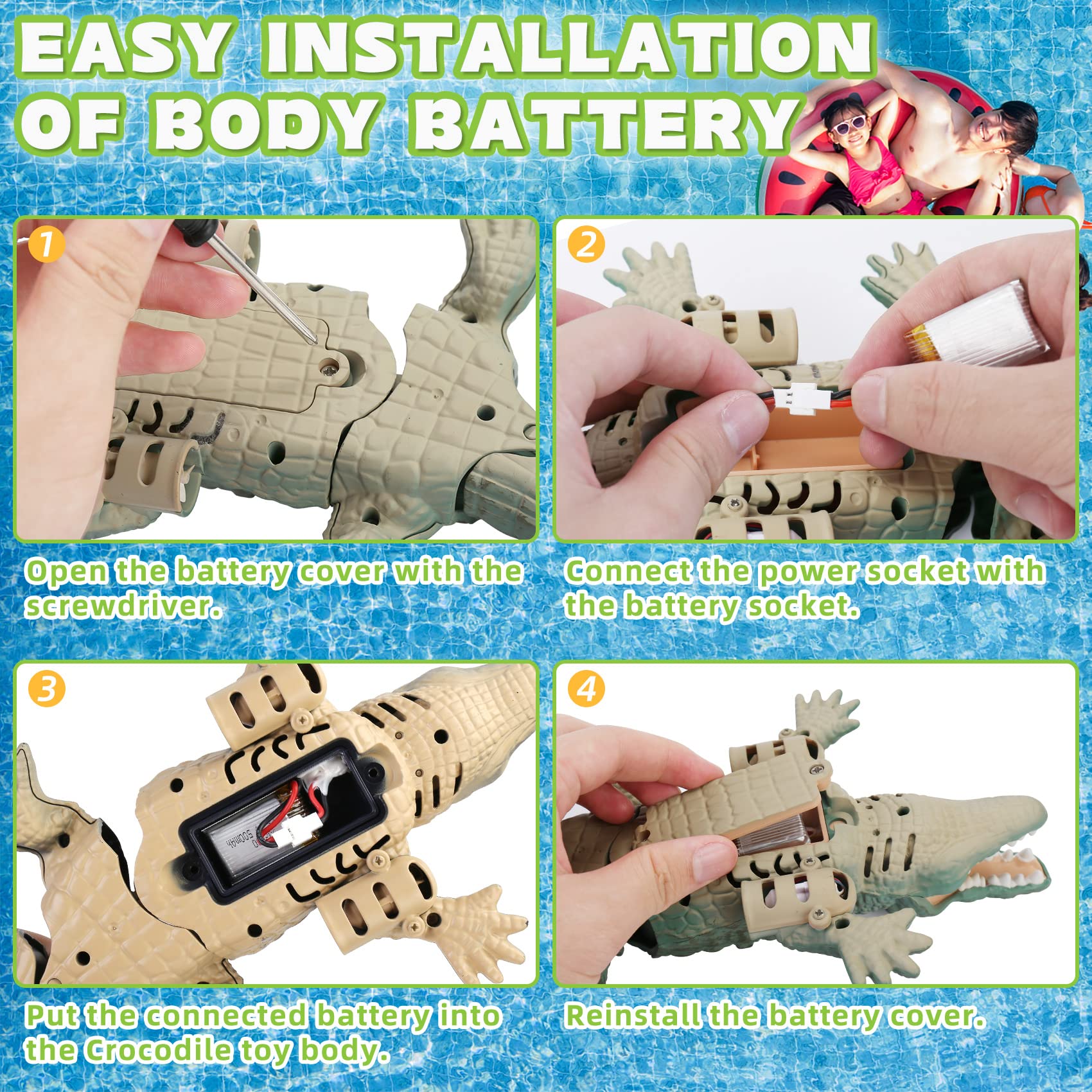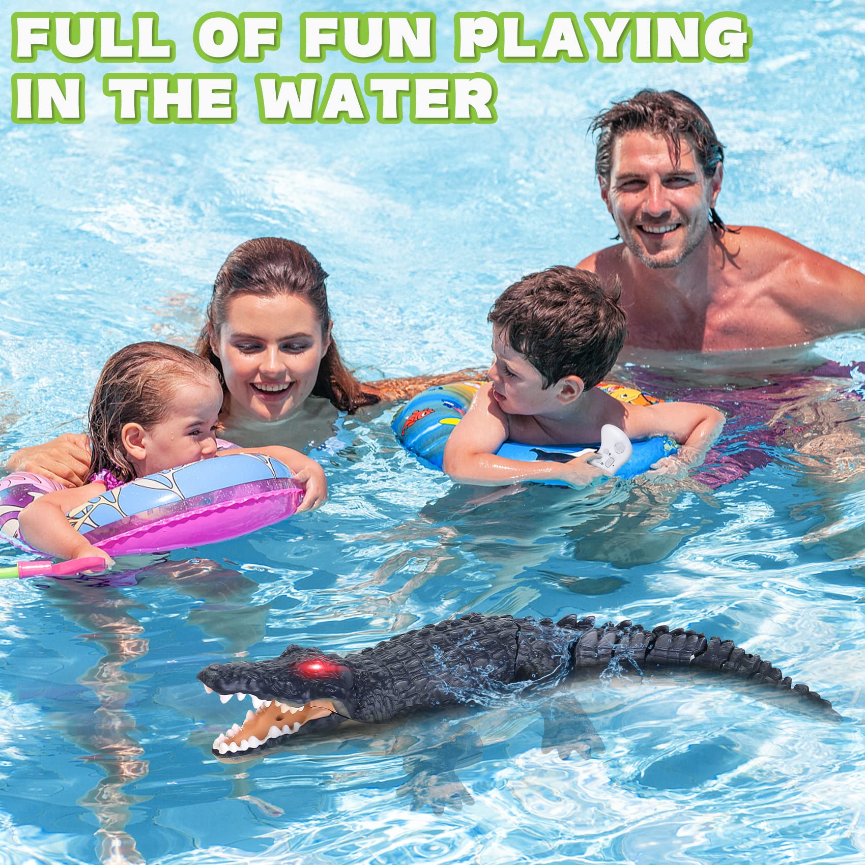• The RC Crocodile toy ONLY play in the water. When palying, put the RC CROCODILE in the water, let the RC CROCODILE body touch the water, then it will start swimming mode, looks like a real Crocodile, Swimming freely in the ocean, water tank, bathtub, or swimming pool etc.