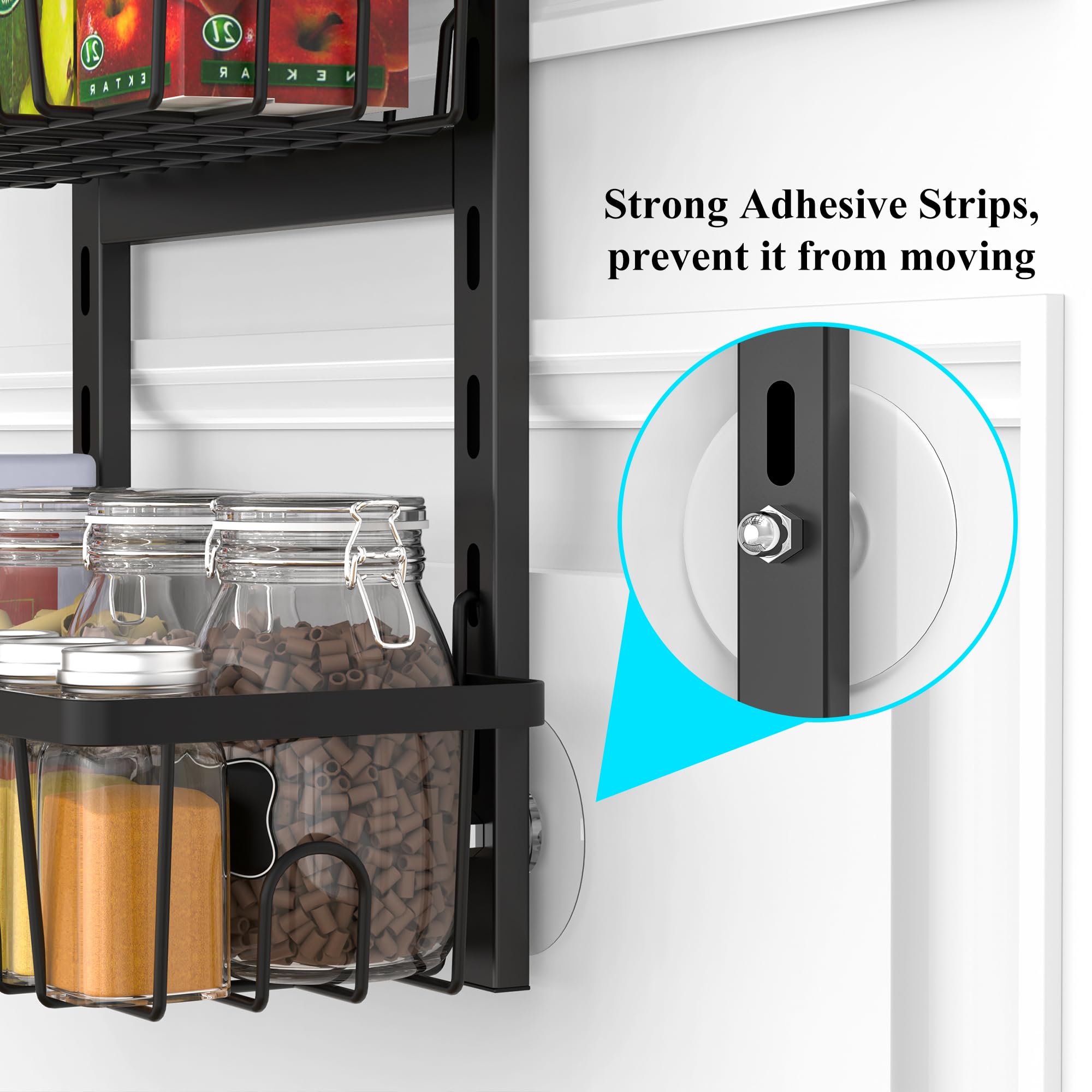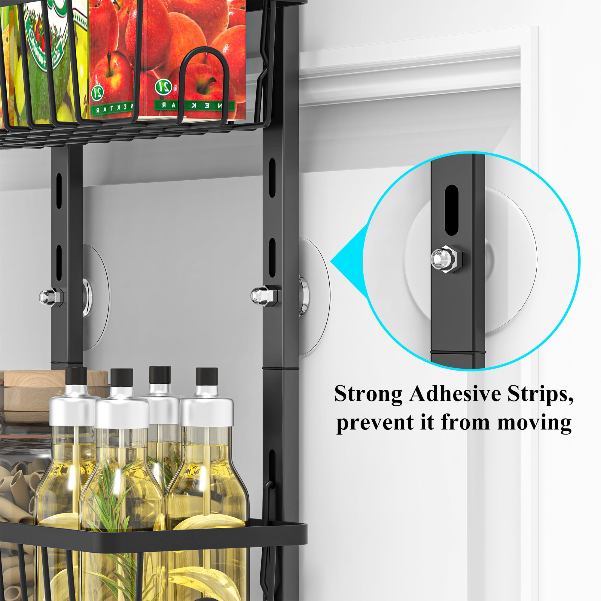 • Strong adhesive mounting strips, which prevent it from moving when opening and closing your door, keep the organizer securely in place