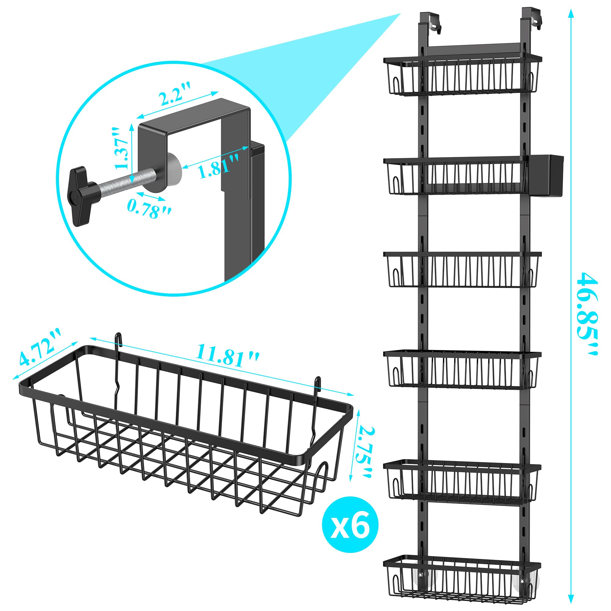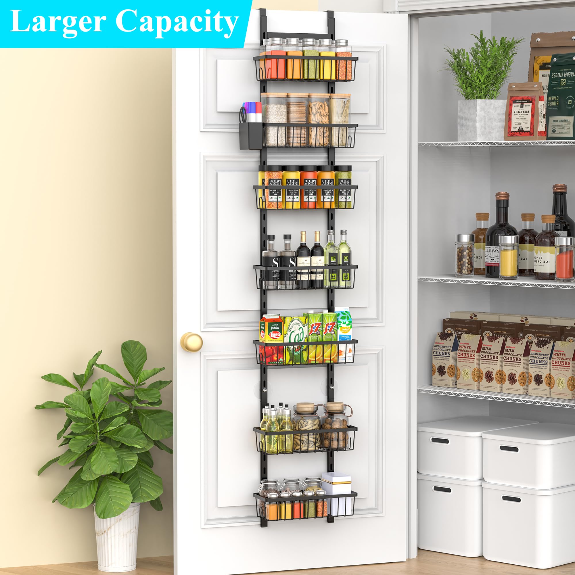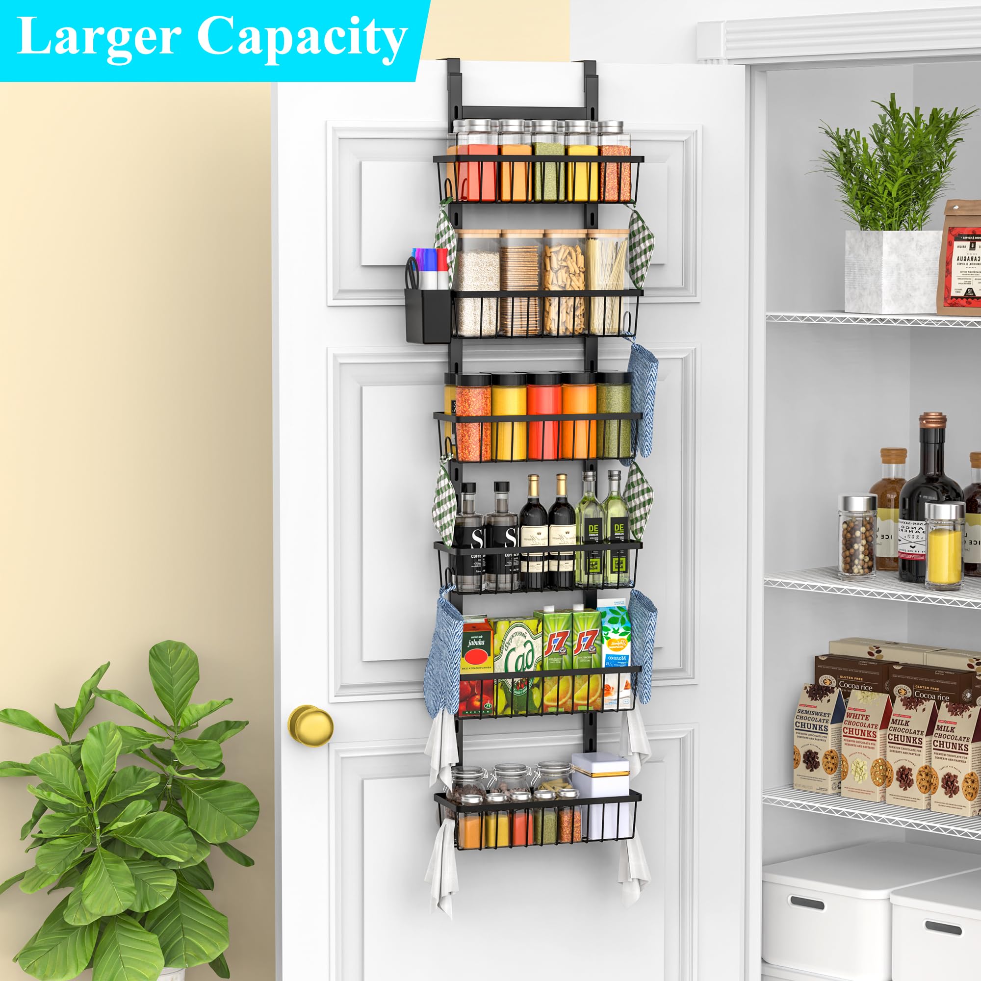 Over The Door Pantry Organizer, 7-Tier Metal Pantry Organization and Storage for Kitchen with Adjustable Shelves, Hanging Spice Seasoning Rack, Black