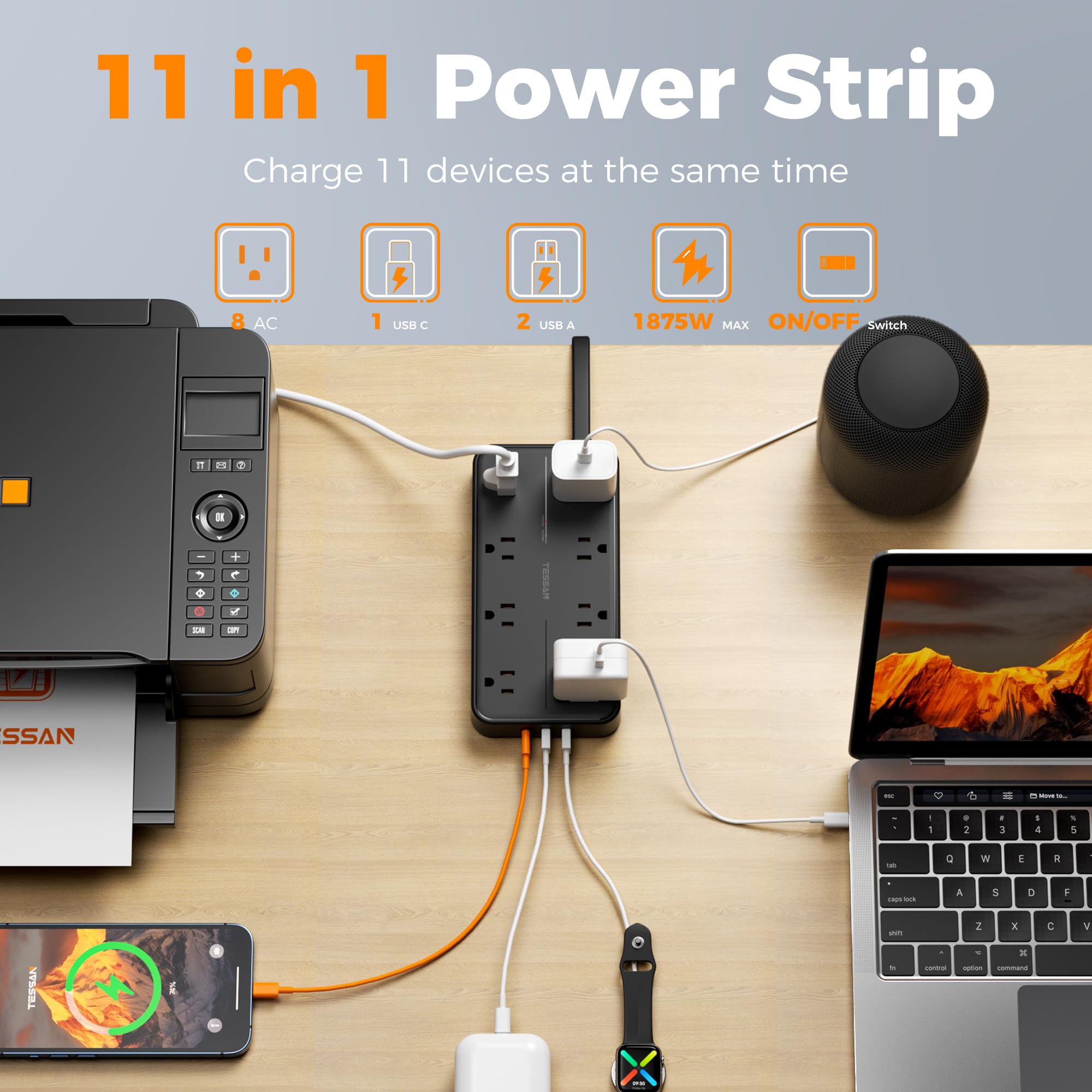 Power Strip Surge Protector, TESSAN Flat Plug Extension Cord with 8 Outlets 3 USB Charger(1 USB C), 1080 Joules Protection, Wall Mountable Charging Station for Home Office School Dorm Room Essentials