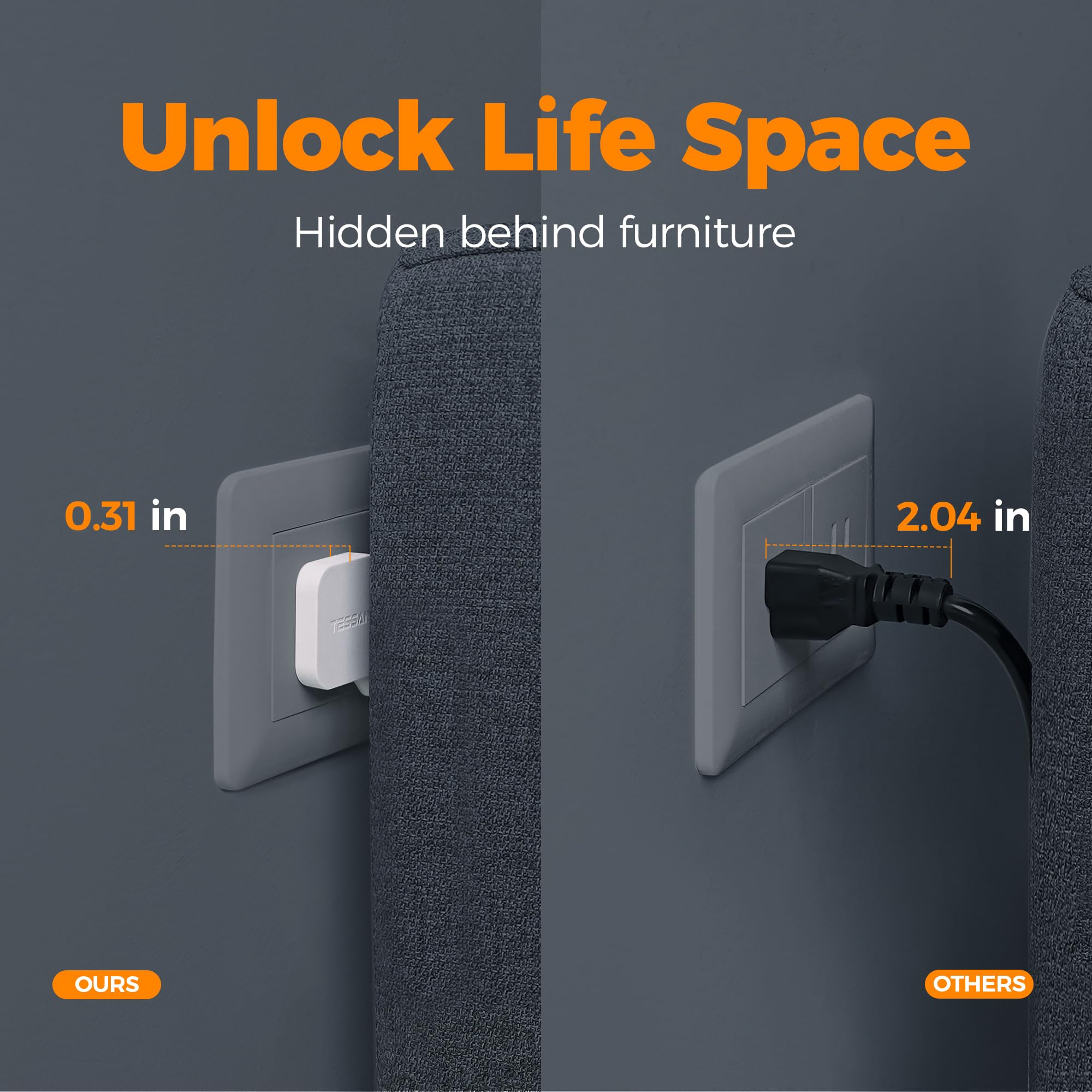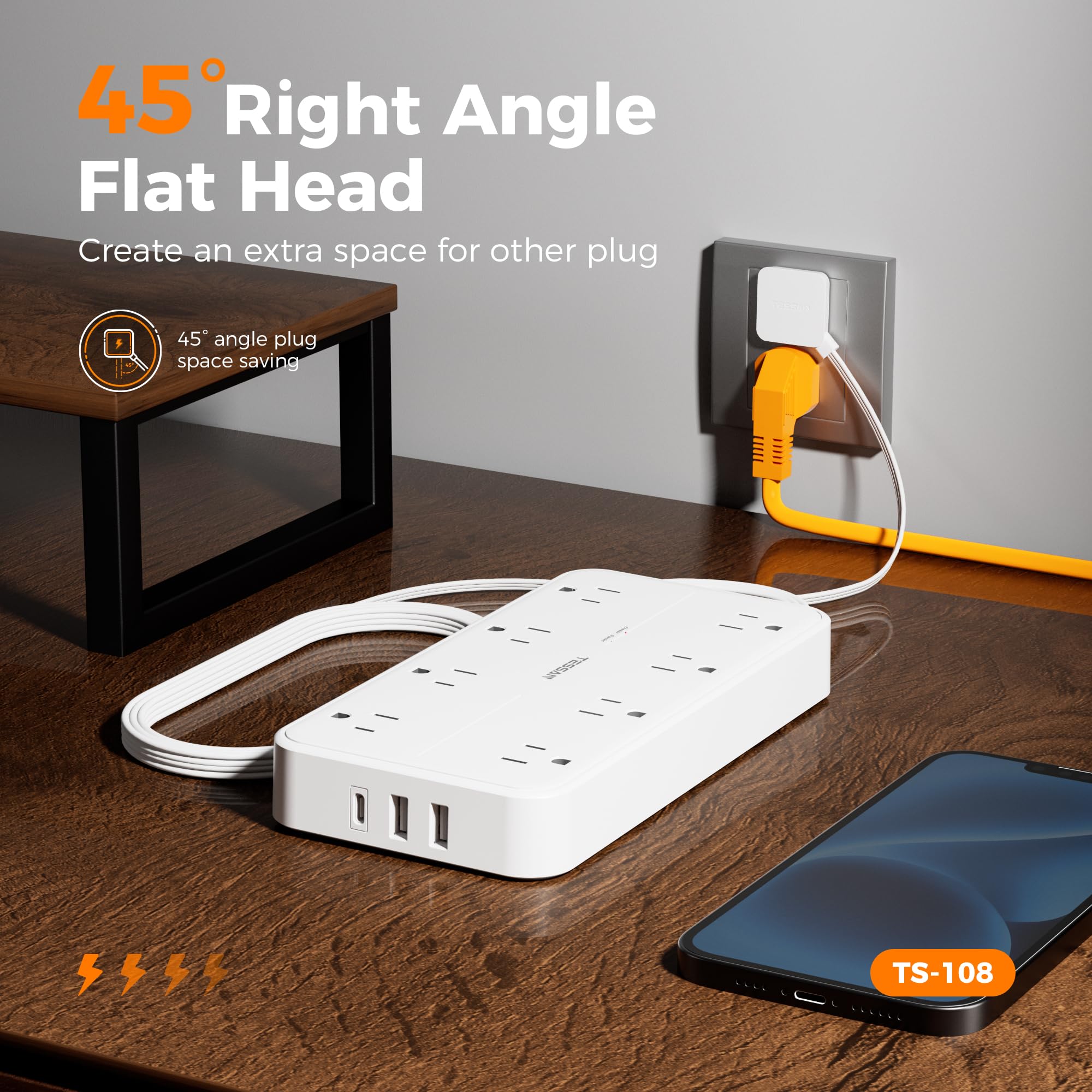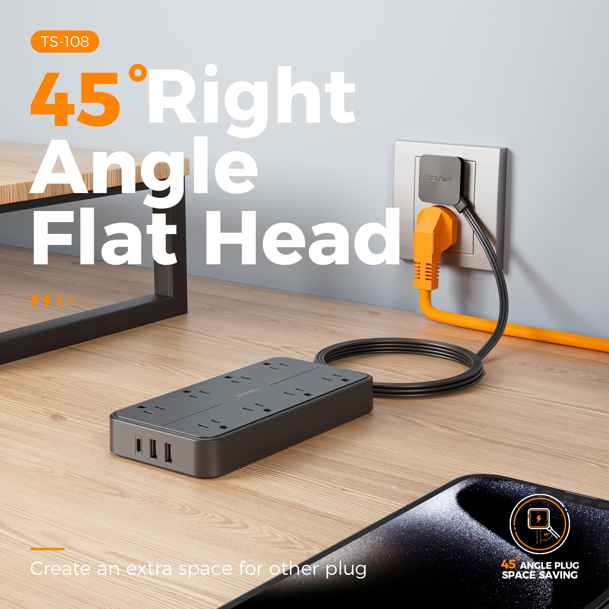 • The 45° angled flat plug fits easily in tight space, keeping other outlets free, is the ultimate space-saving power strip for home, hotel, office.