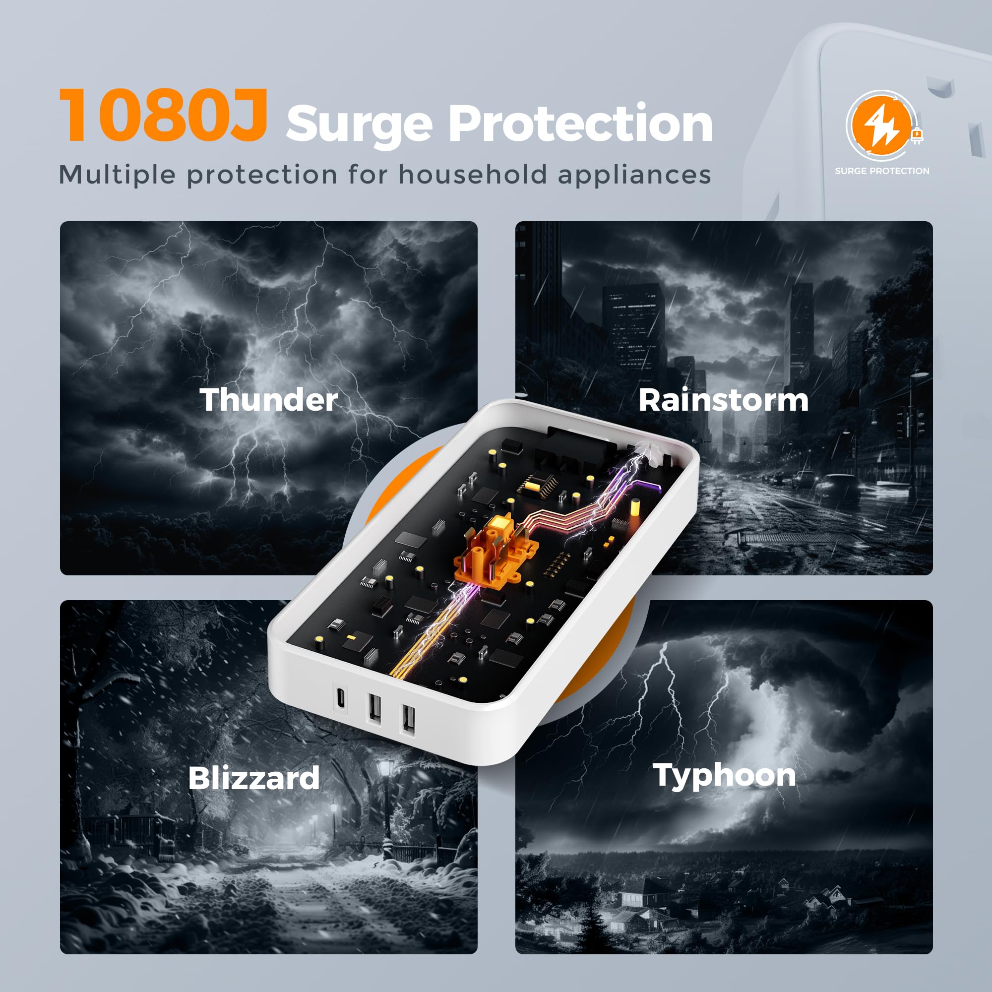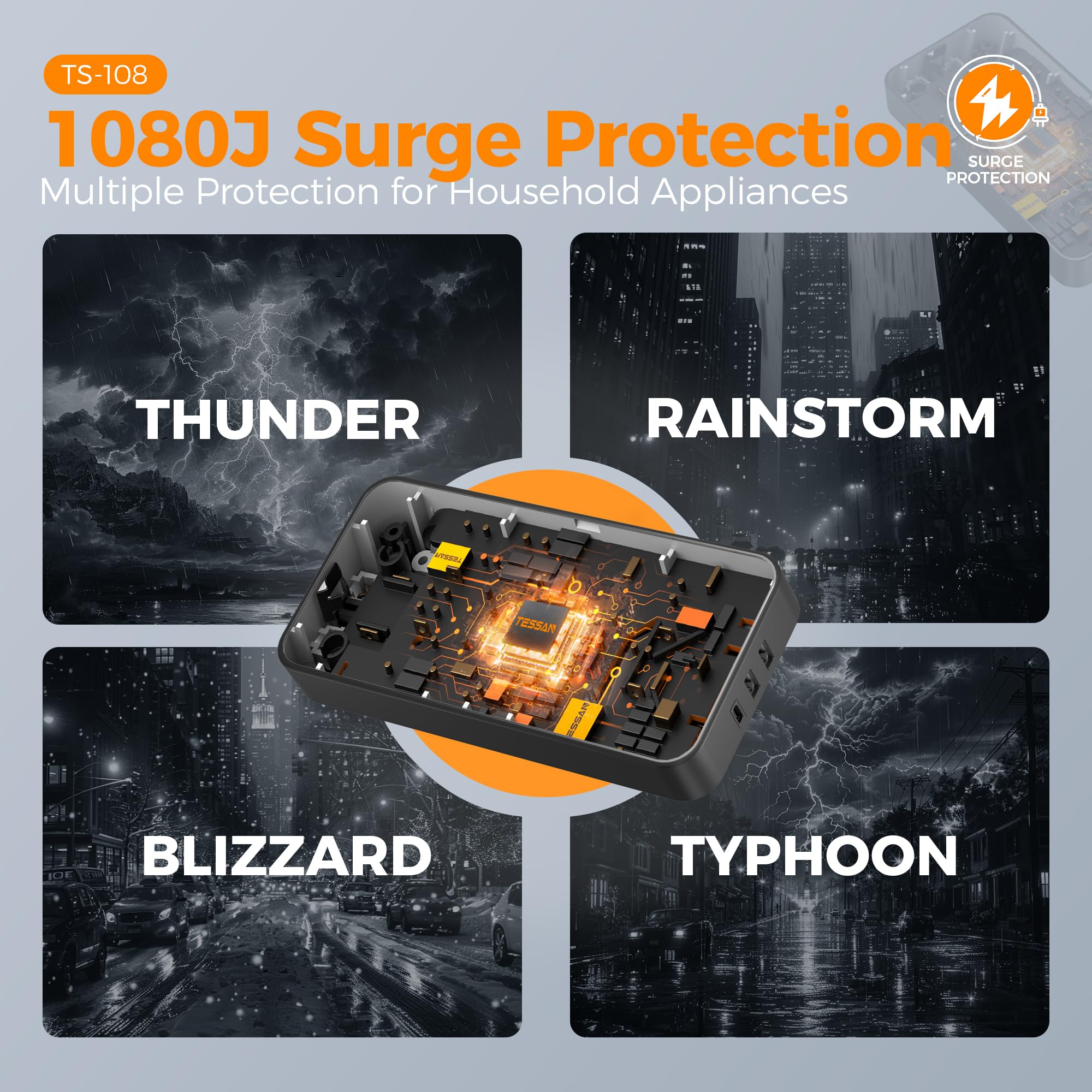 • 1080 Joule Energy Rating secures your electronic devices from overload, short circuits, power spikes, lighting strikes, or fluctuations, providing a reliable power extension hub to protect devices.