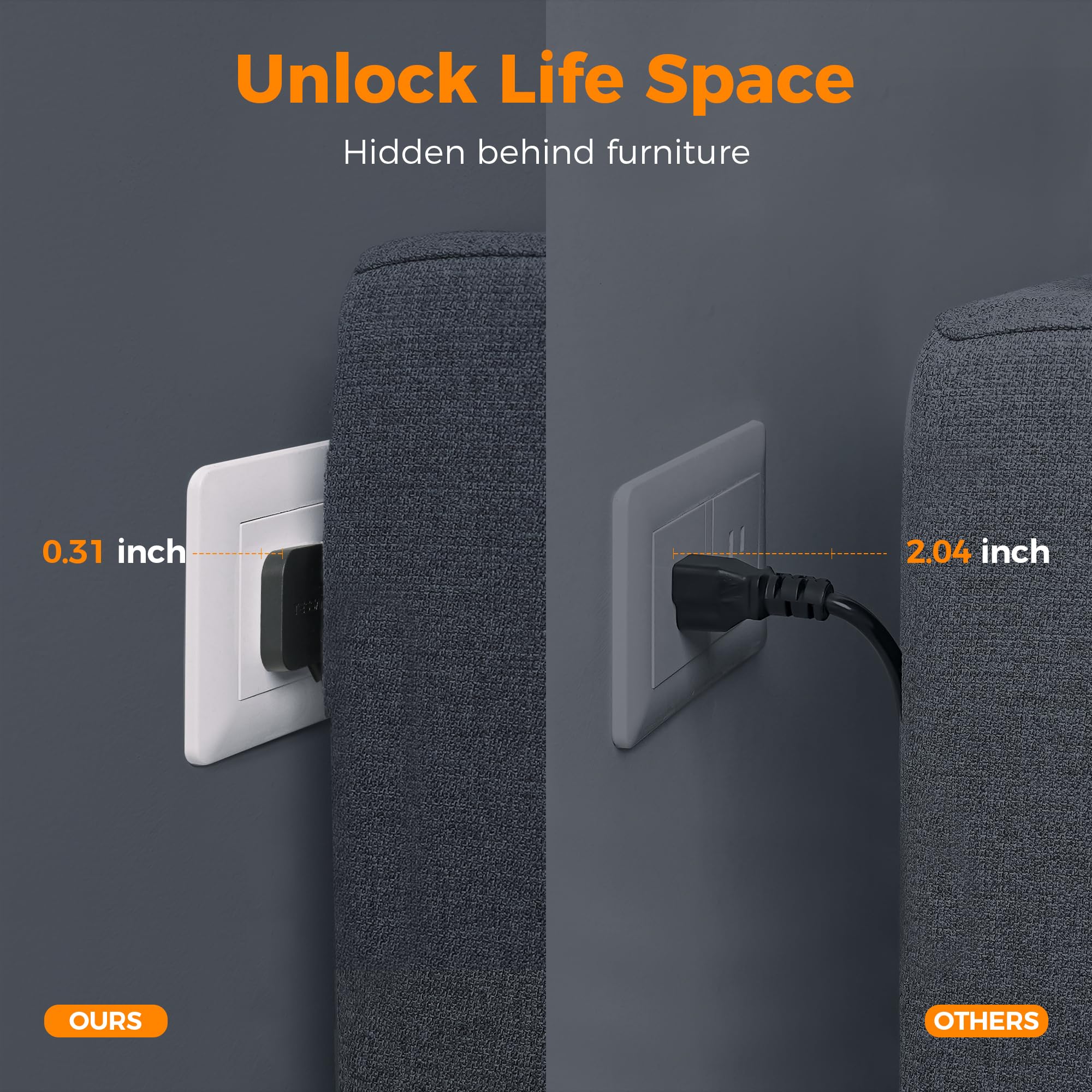 • Flat plug could be easily hide in the back the furniture, which can maximum save your outlet space occupied