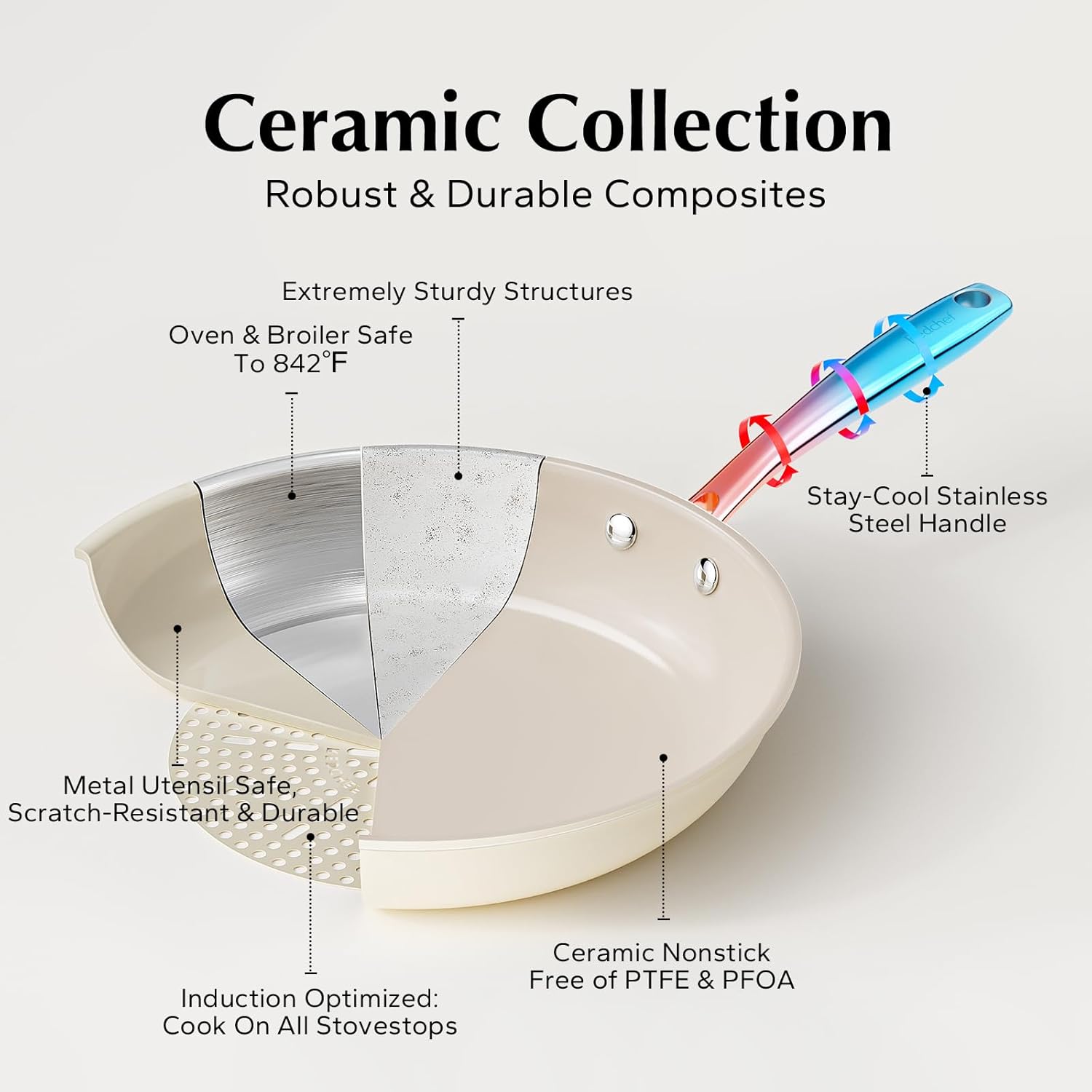 Redchef Ceramic Pots and Pans Set, Deep Saute Pan with Lid, Skillet,8" 9.5" 11" Frying Pan 5QT Jumbo Cooker with Stay Cool Handle, Beige White