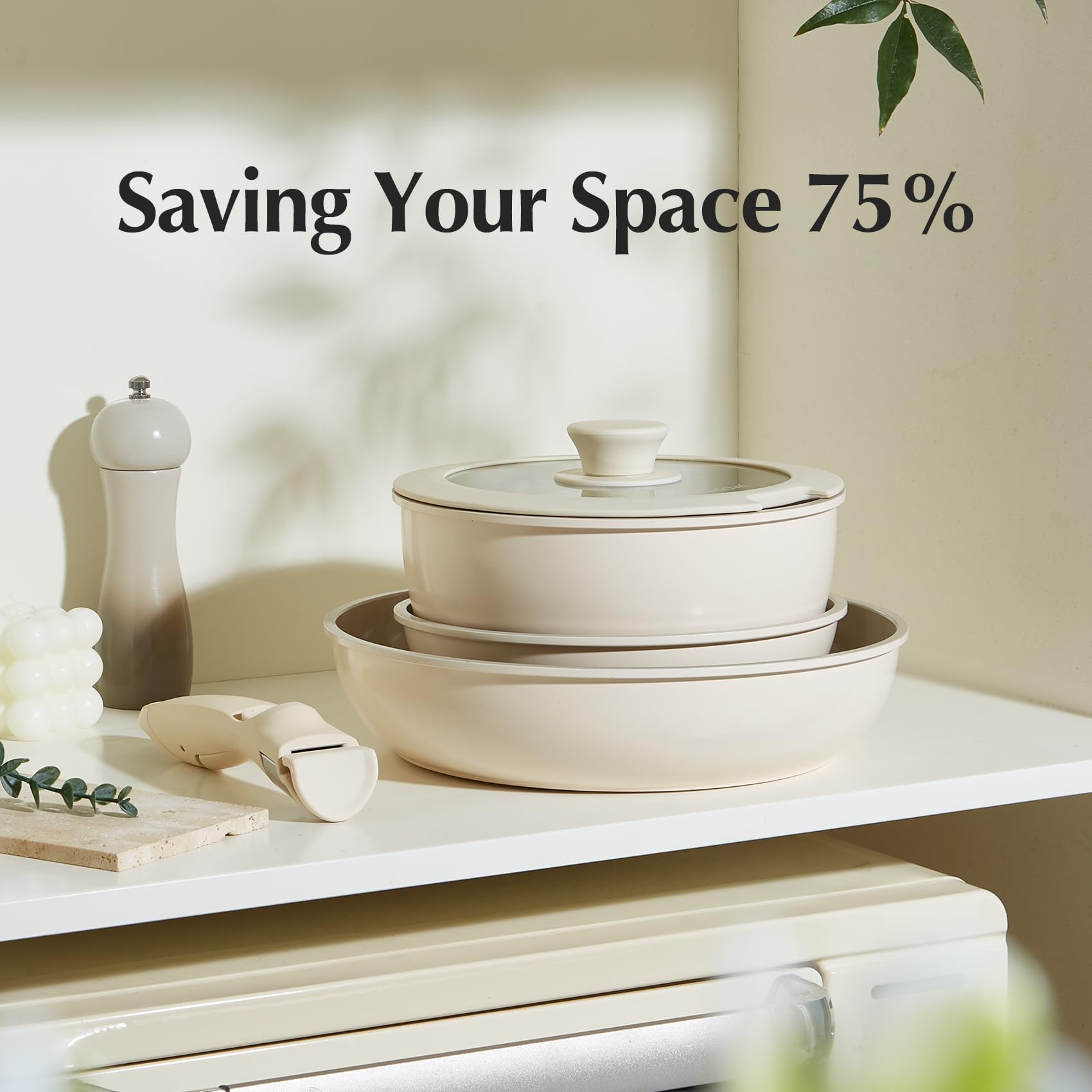 • 75% Space-Saving: Save up to 75% more space with stackable pots and pans set and detachable handles; Neatly stack all the pots and pans, saving 75% of cabinet space—keeping the kitchen organized and tidy; Perfect for compact kitchens and an ideal choice for RVs or campers