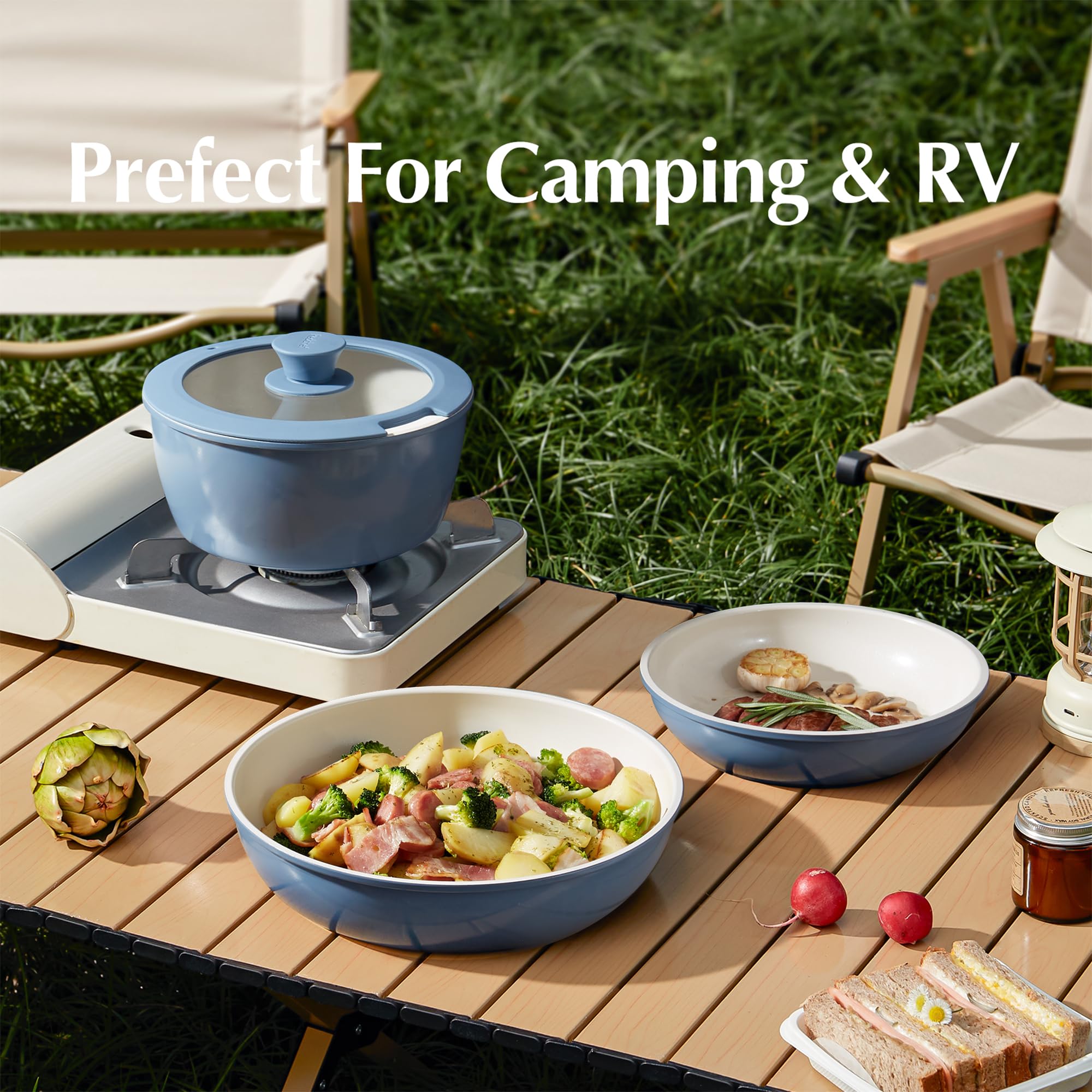 • Kitchen cookware set includes: a 2.5 quart saucepan, a 8-inch frying pan, an 10-inch large frying pan, a 8-inch visible silicone rimmed glass lid, and a detachable handle; This Redchef set has everything you need for your day-to-day cooking and is also suitable for RV or camping, making it an ideal cookware set for outdoor cooking