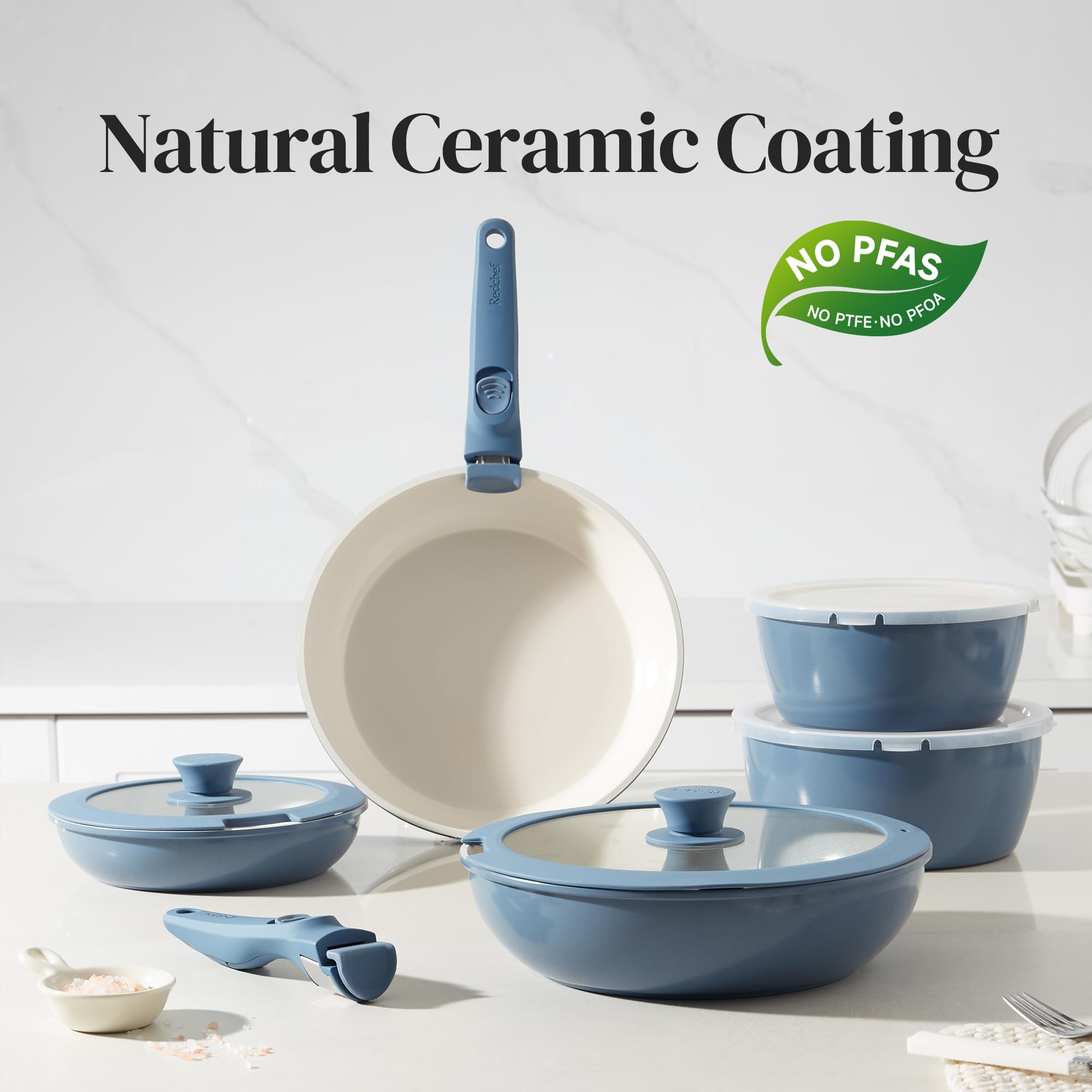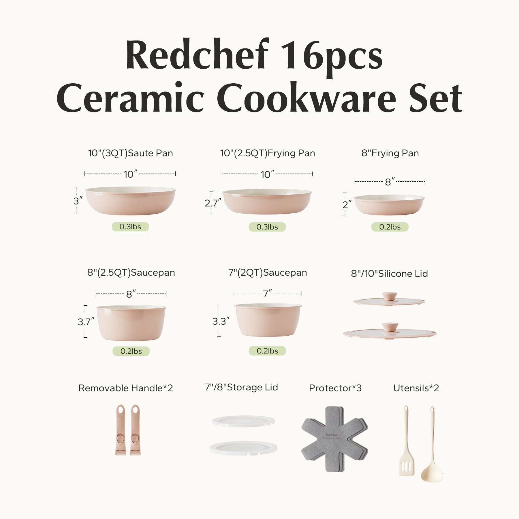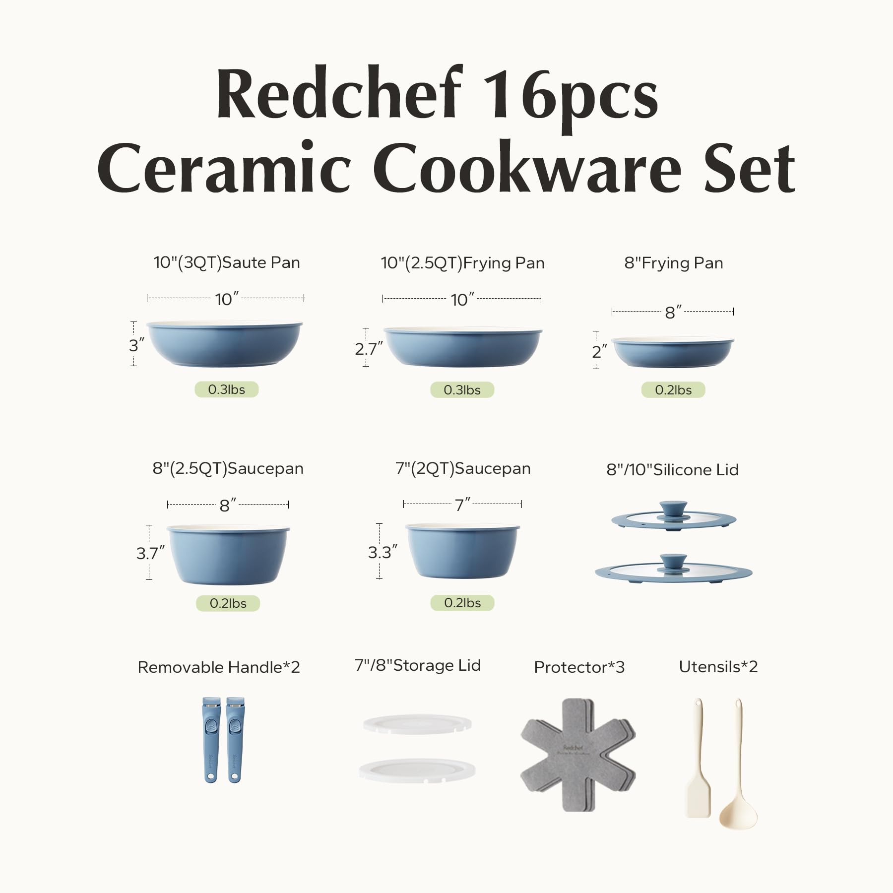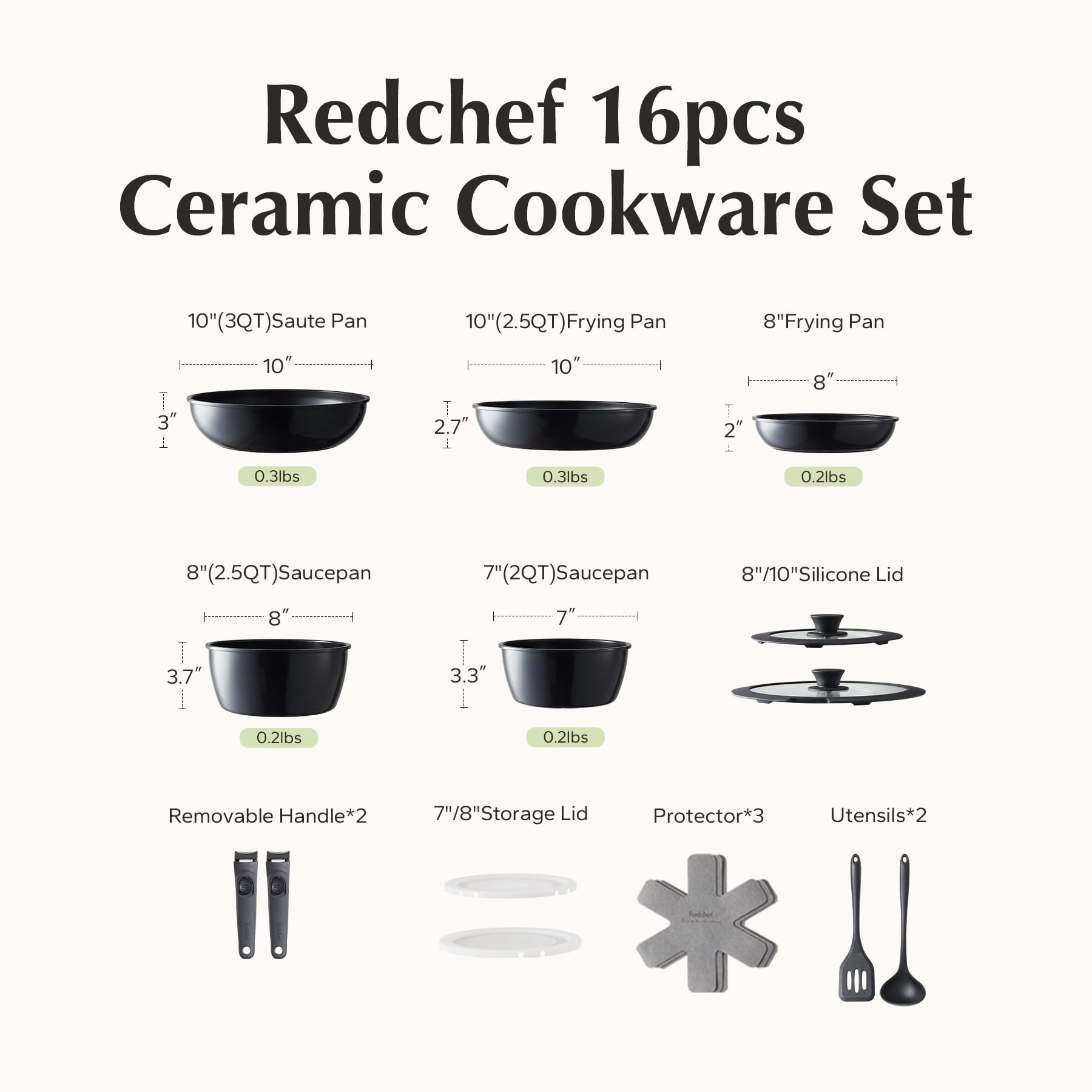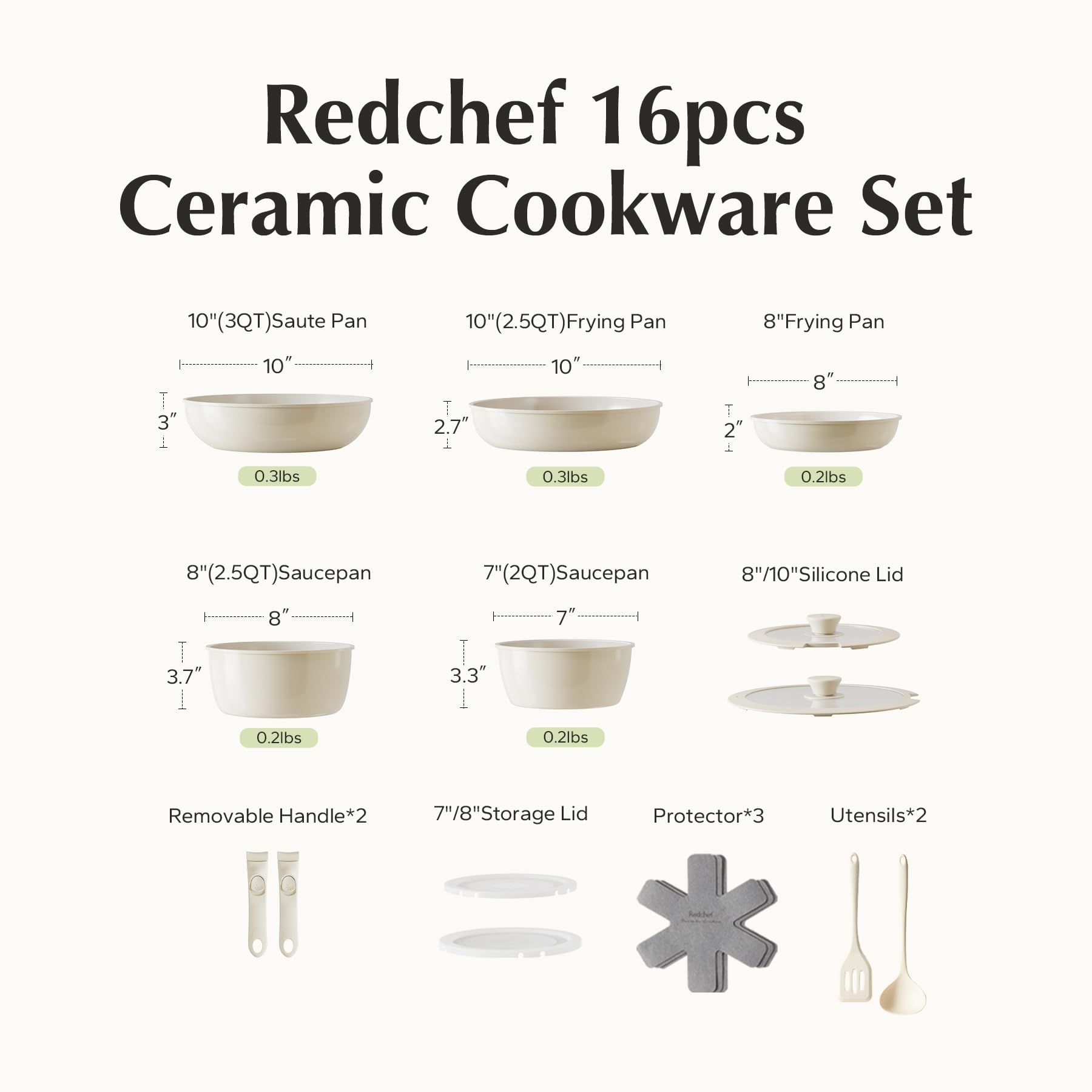 Redchef Ceramic Pots and Pans Set, Nonstick Kitchen Cookware Set with Detachable Handle, Non Toxic Cookware Set 16pcs, PFAS PFOA & PTFE Free, RV Ceramic Cookware for Camping, Dishwasher/Oven Safe