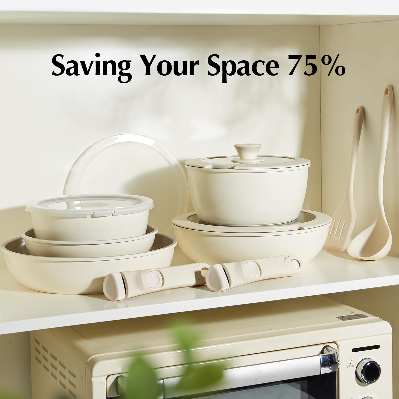 • 75% Space-Saving: Save up to 75% more space with stackable pots and pans set and detachable handles. Neatly stack all the pots and pans, saving 75% of cabinet space—keeping the kitchen organized and tidy. Perfect for compact kitchens and an ideal choice for RVs or campers