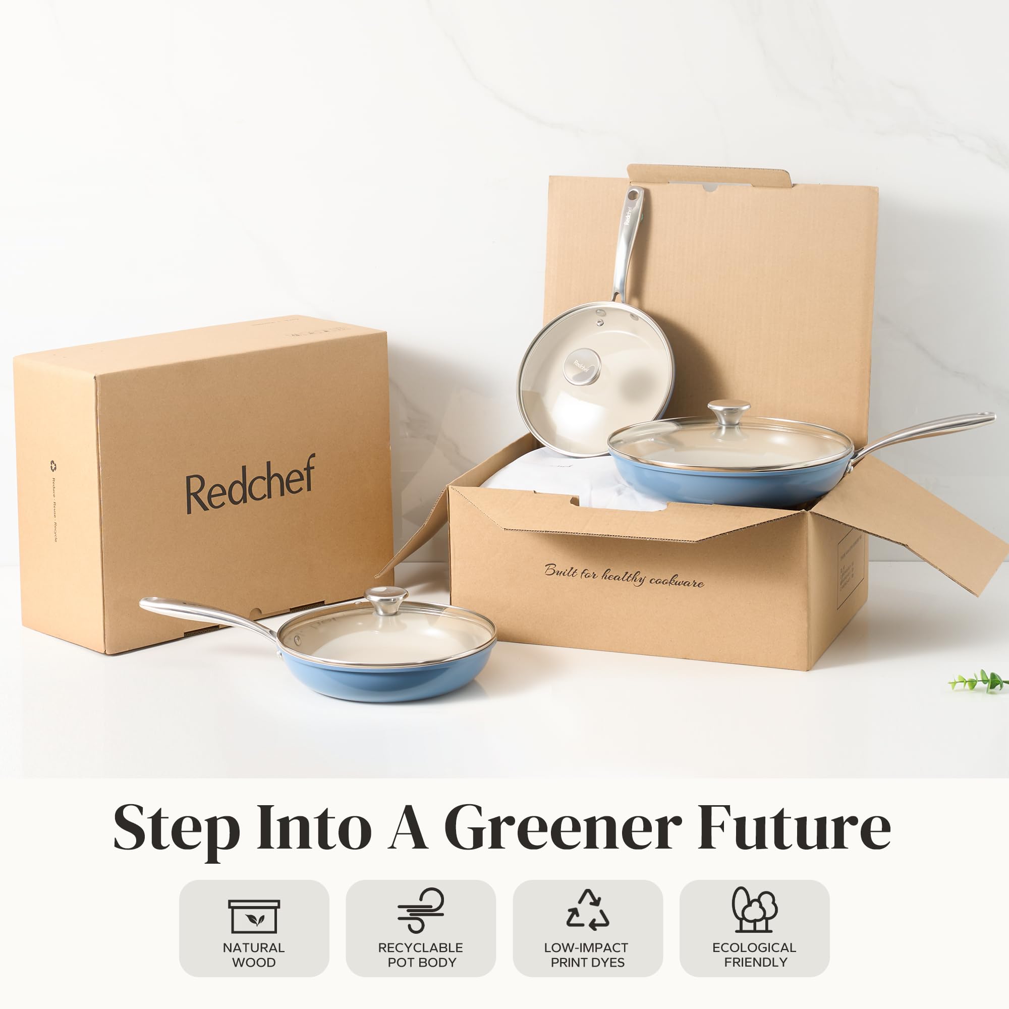 Redchef Nonstick Cookware Sets, Frying Pan Set with Tempered Glass Lids, Ceramic Cookware Set, Stay-Cool Handles, Dishwasher & Oven Safe, Compatible with All Cooktops, Beige (8+9.5+11 Inch)