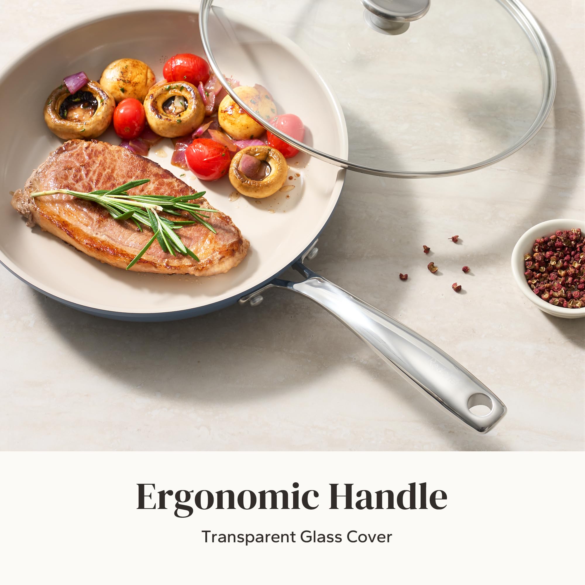 • COOL & STURDY HANDLE: Crafted from lightweight, precision-pressed stainless steel, this ergonomically designed handle ensures a comfortable grip. Double-riveted for exceptional strength and maneuverability, the ceramic skillet pan empowers you to seamlessly transition from stovetop to oven, allowing you to achieve that flawless sear, brown toppings, or even bake