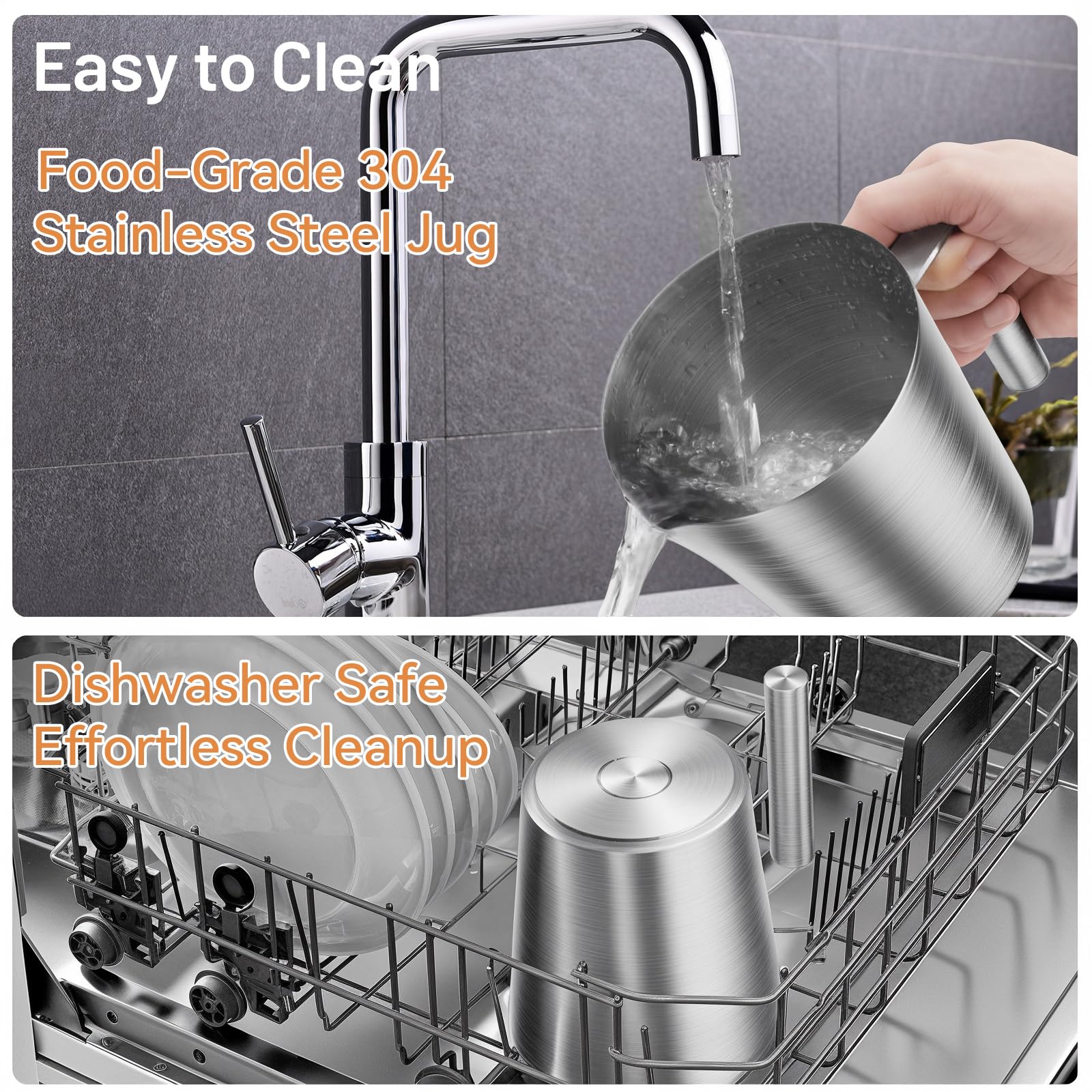 - Stainless steel milk jug is dishwasher safe and can be easily removed from the base for cleaning.