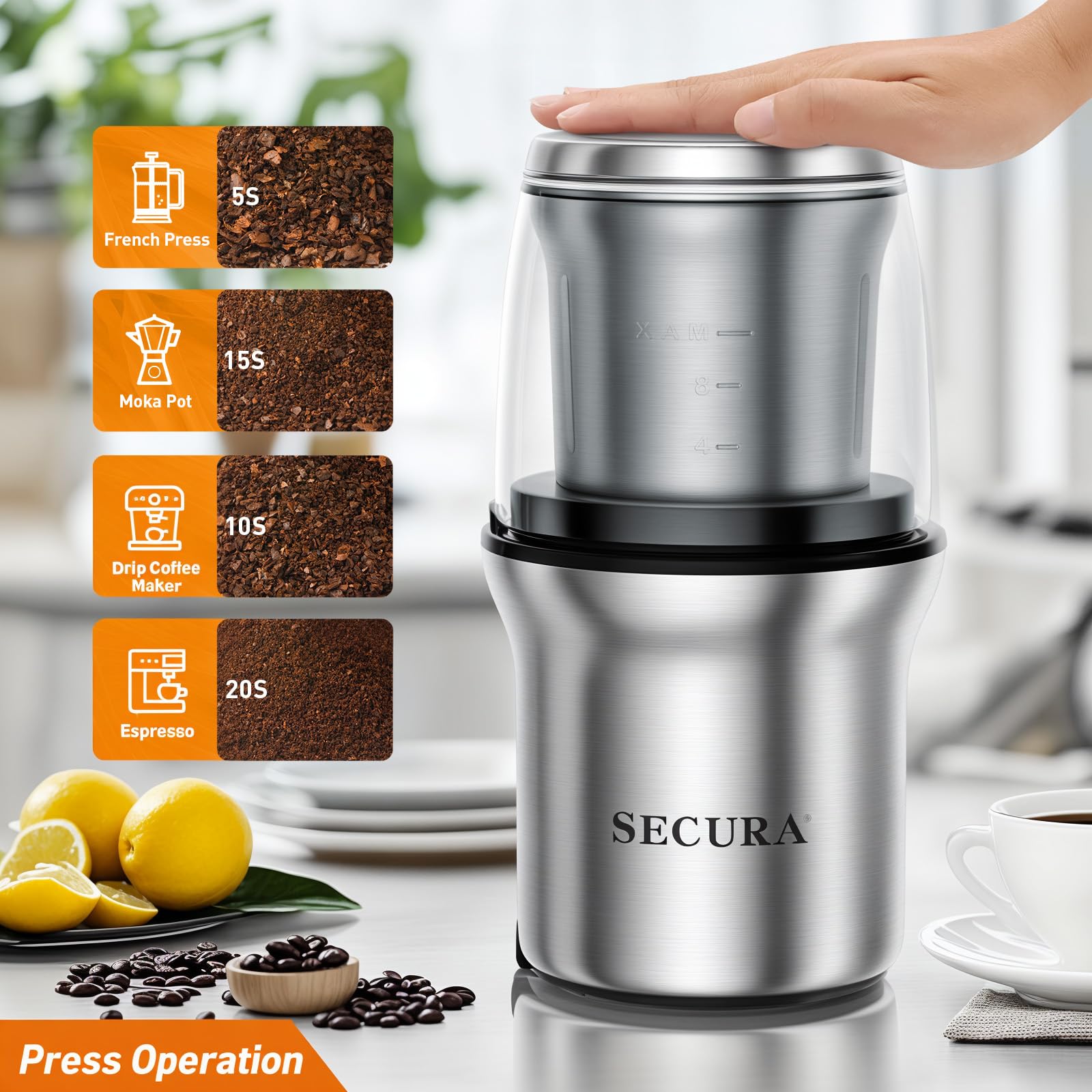 - Removable Grinding Bowls – Comes with two separate bowls for coffee and spices, ensuring easy cleanup and preventing flavor mixing