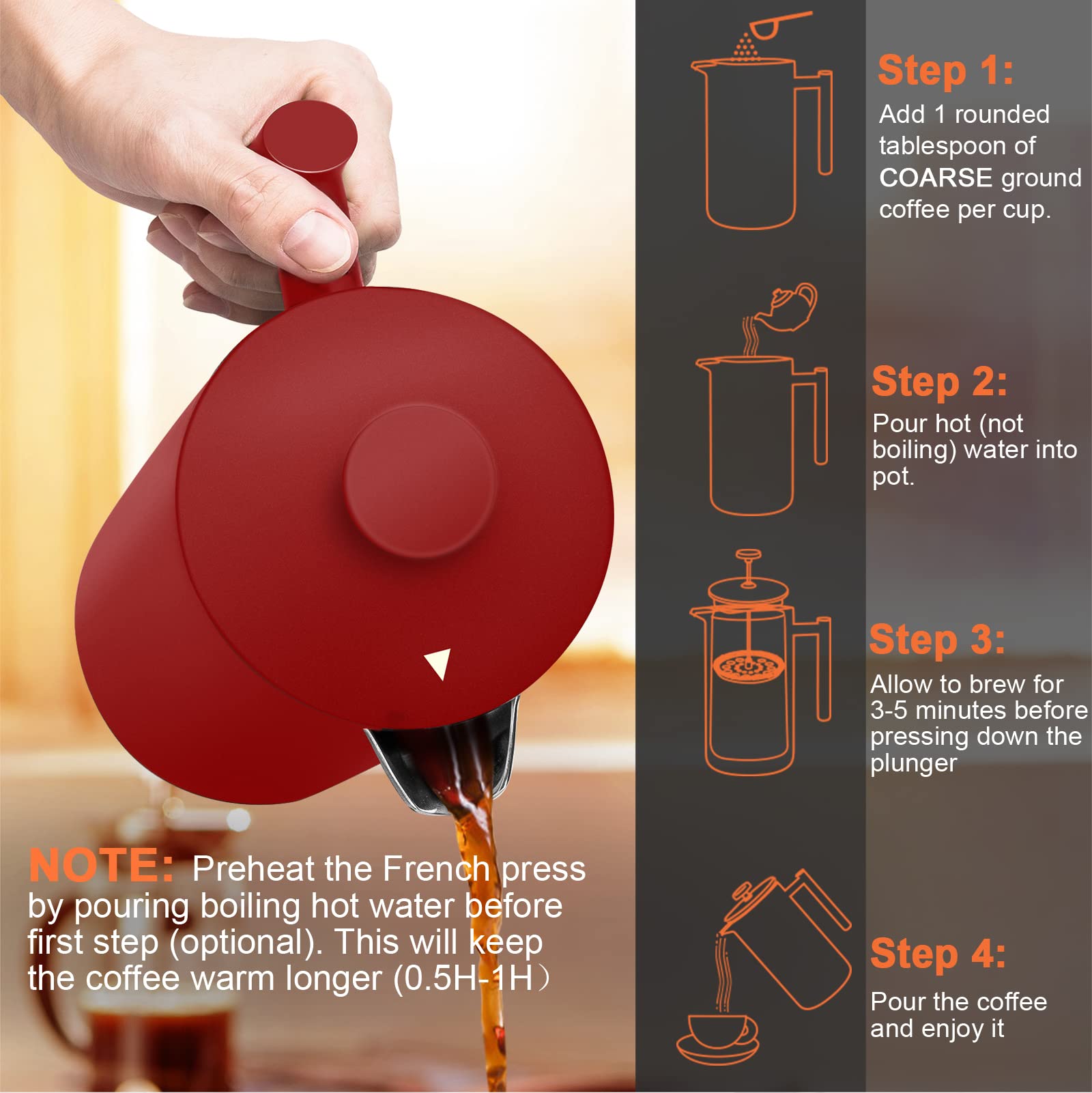 - This French press maker comes with a Cool touch handle and knob for comfortable and safe pouring