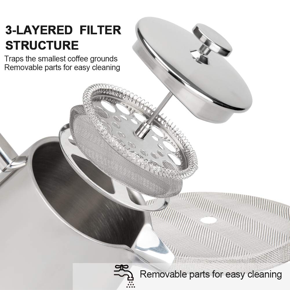 Secura stainless steel French Press coffee maker is made from top quality 304 stainless steel, both the interior and exterior, other French press may use 304 stainless steel on one side only. This Stainless Steel French Press is made to outlast other coffee makers.
