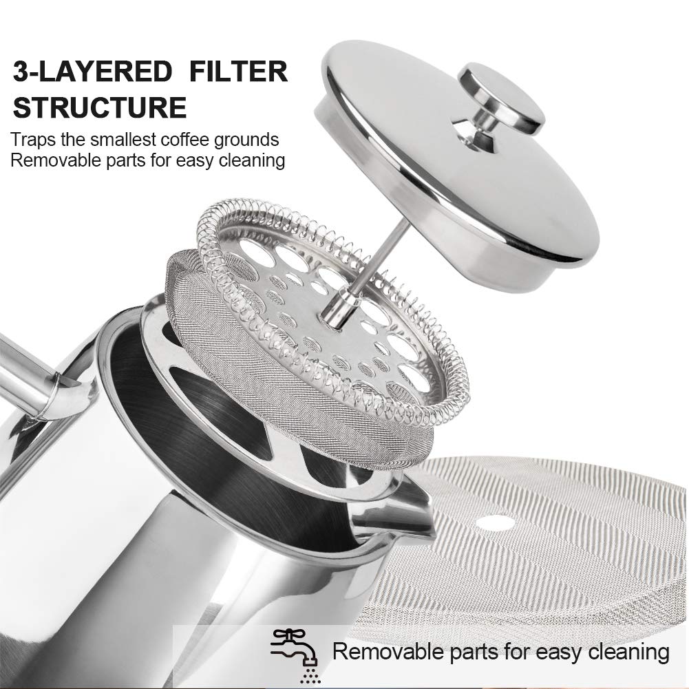 Stainless Steel Screen included with this French press coffee maker. The filter screen is easy to disassemble and clean. Stack one or more screens together to give your espresso a more refined taste