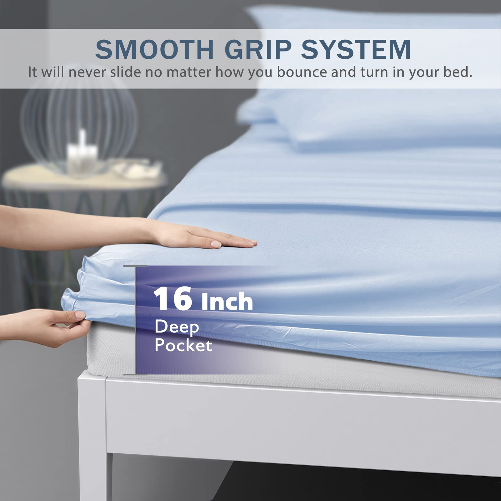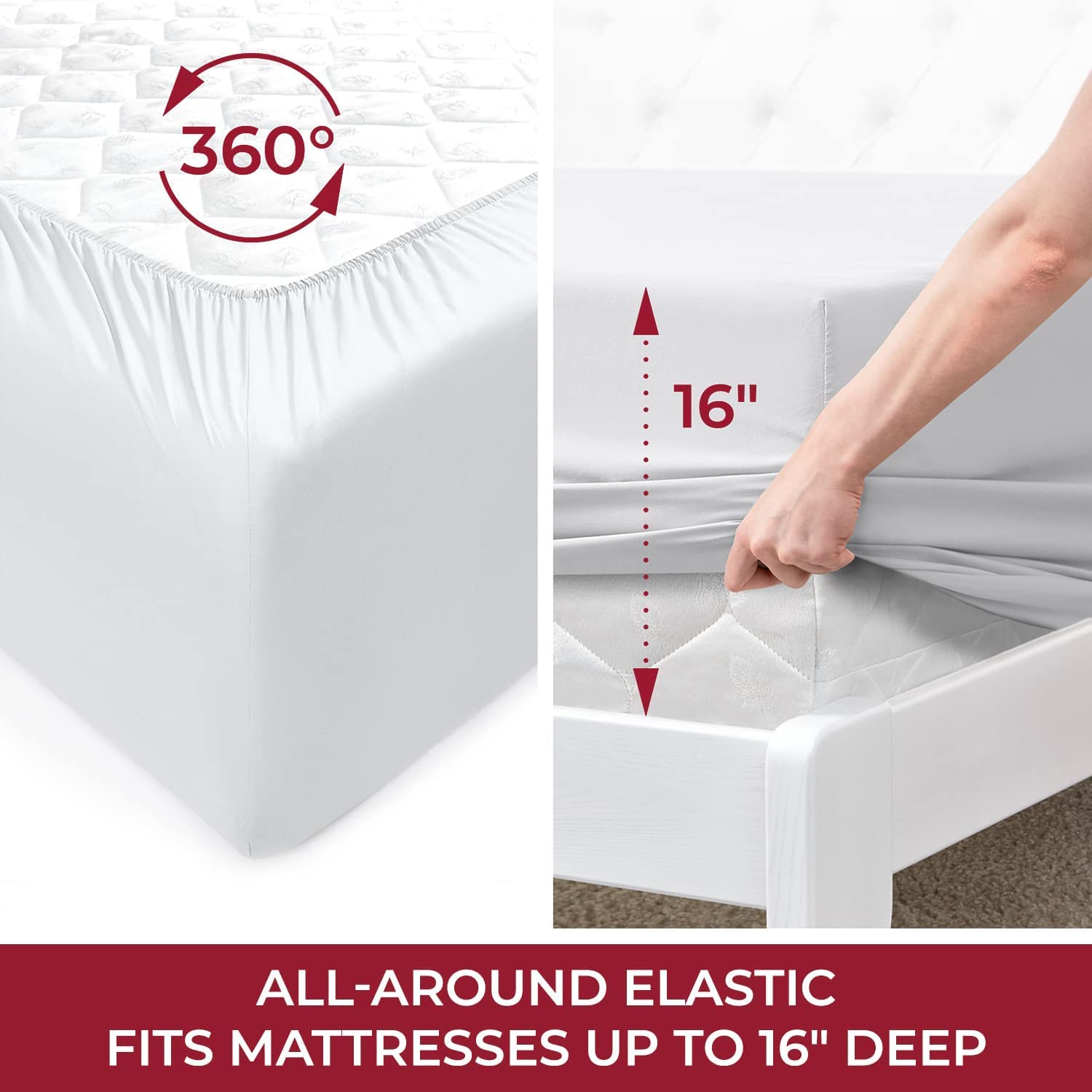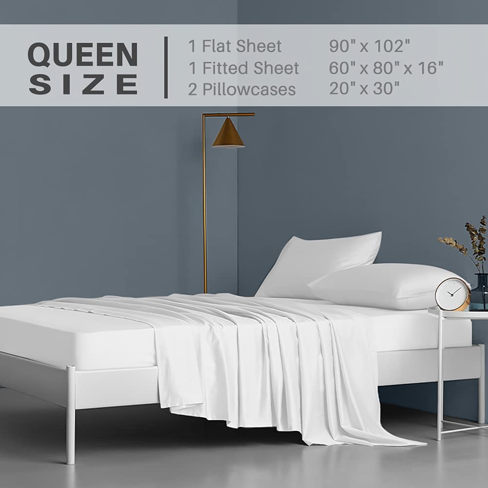 - 4PC QUEEN SHEETS SET -- 1 Flat Sheet 90"x102", 1 Fitted Sheet 60"x80"×16", 2 Pillowcases 20"x30". Deep pockets that fit mattresses up to 16" deep with elastic all around, more than other bed sheets to grip and fit