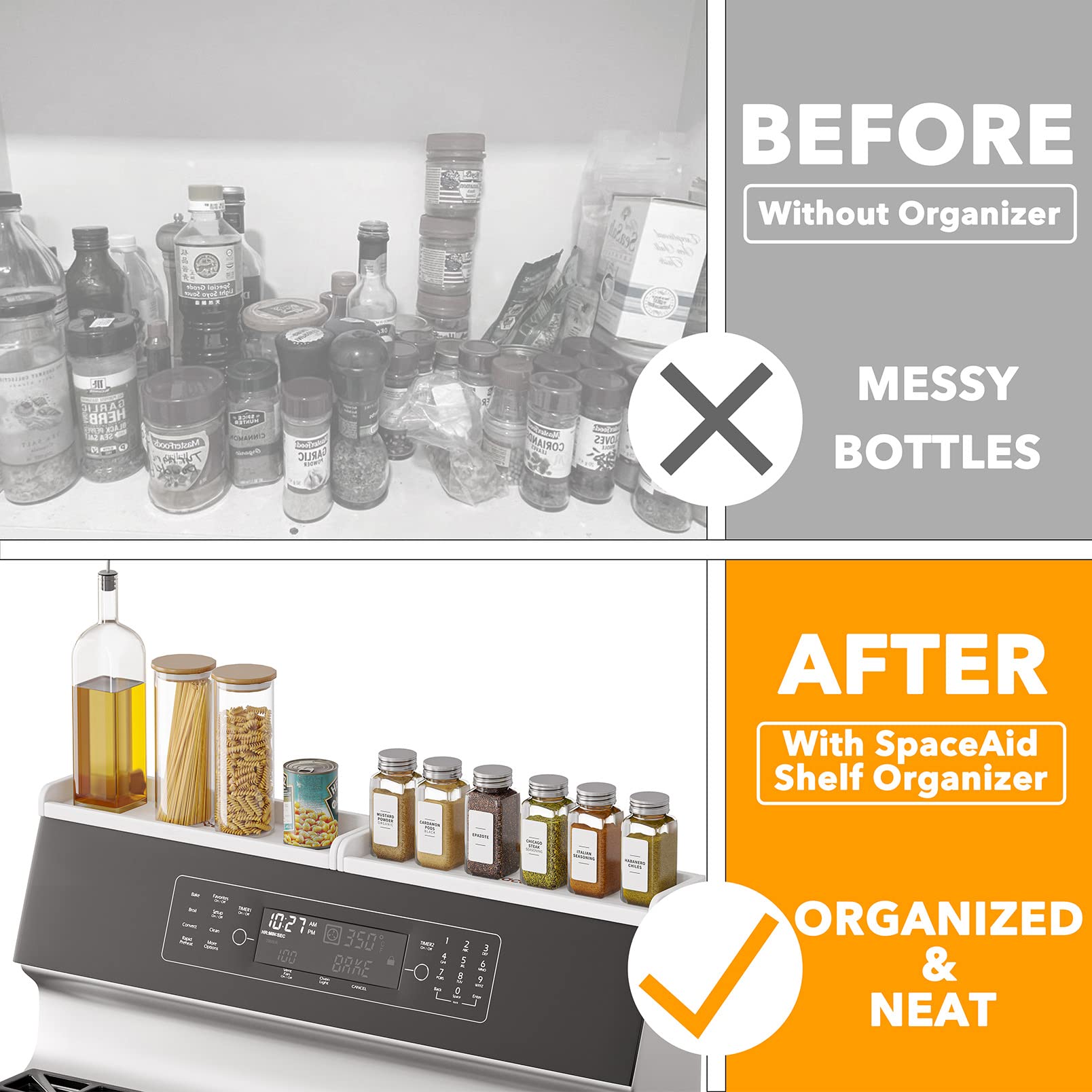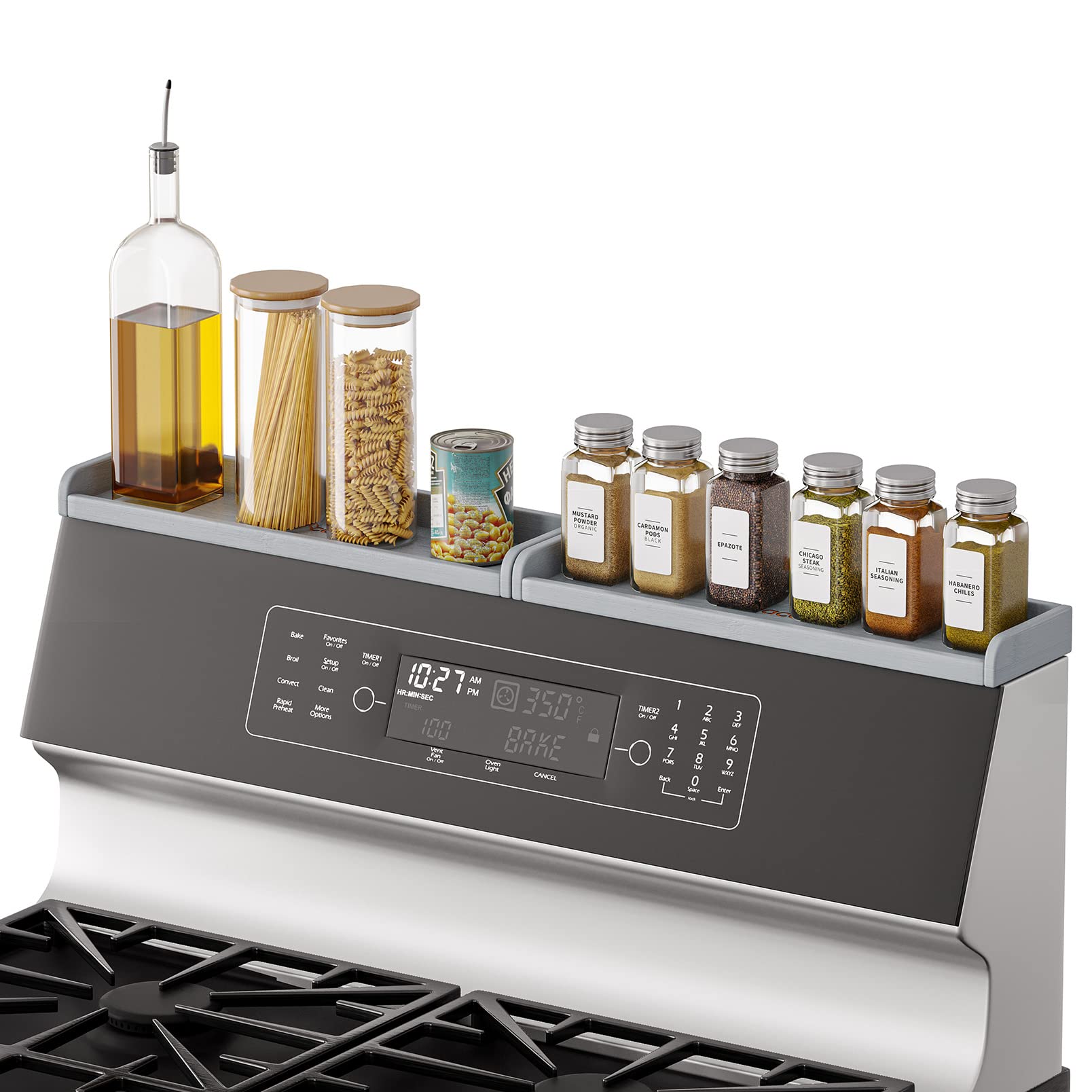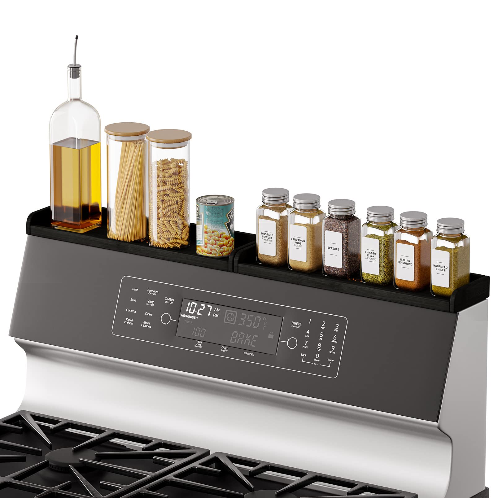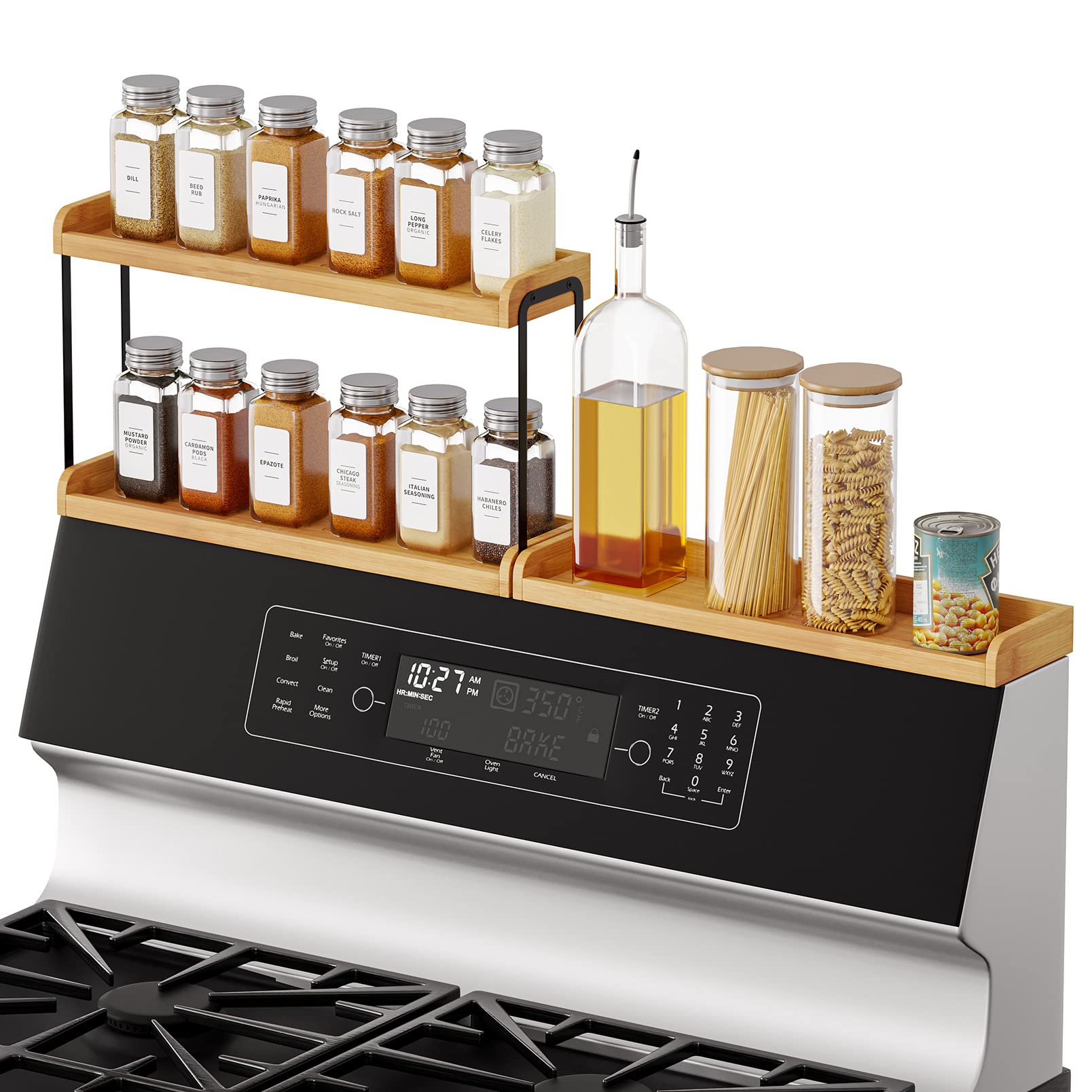 - ORGANIZED AND BEAUTIFUL - Make your kitchen stove neat and organized with bamboo stove top organizer; The holder rack is designed for giving extra space over oven; Each Shelf SIZE: 15"W x 4"D x 1.3"H (2 Pack, Up to 30" Length)