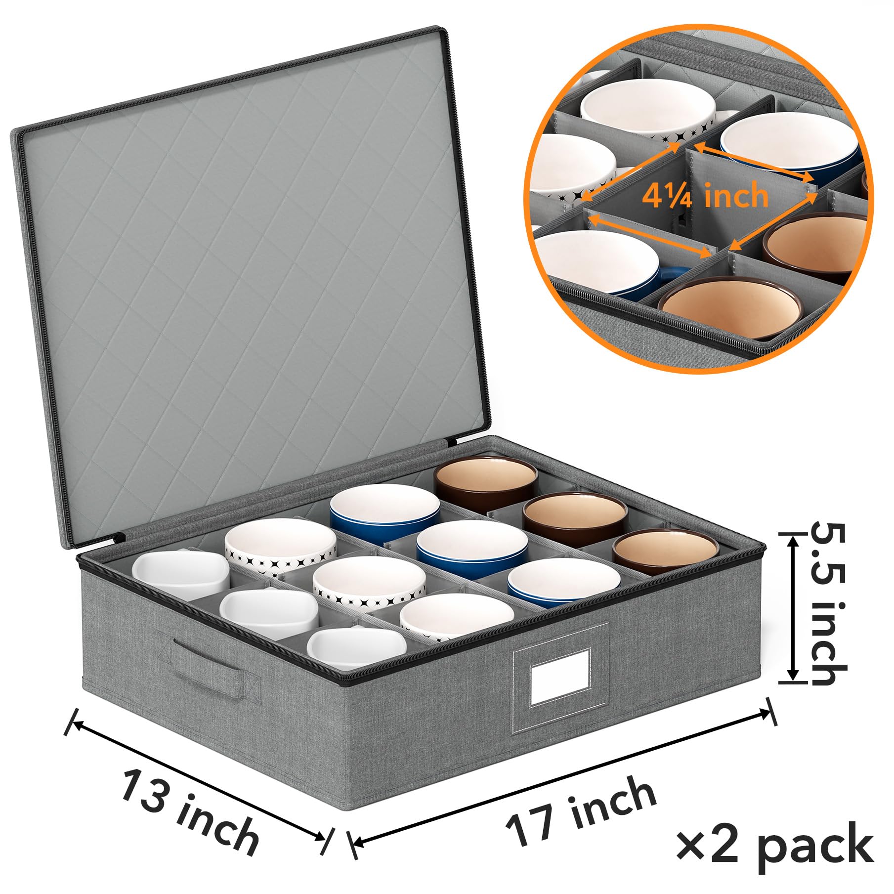 - Comprehensive Set: Included in this package are five versatile storage units, varying in size from large to compact, to accommodate an extensive range of dinnerware sizes. 1 dinner plate case, 1 salad plate case, 1 dessert plate case, 1 saucer plate case, 1 platter case, and 1 coffee mugs case. Also includes felt dividers.
