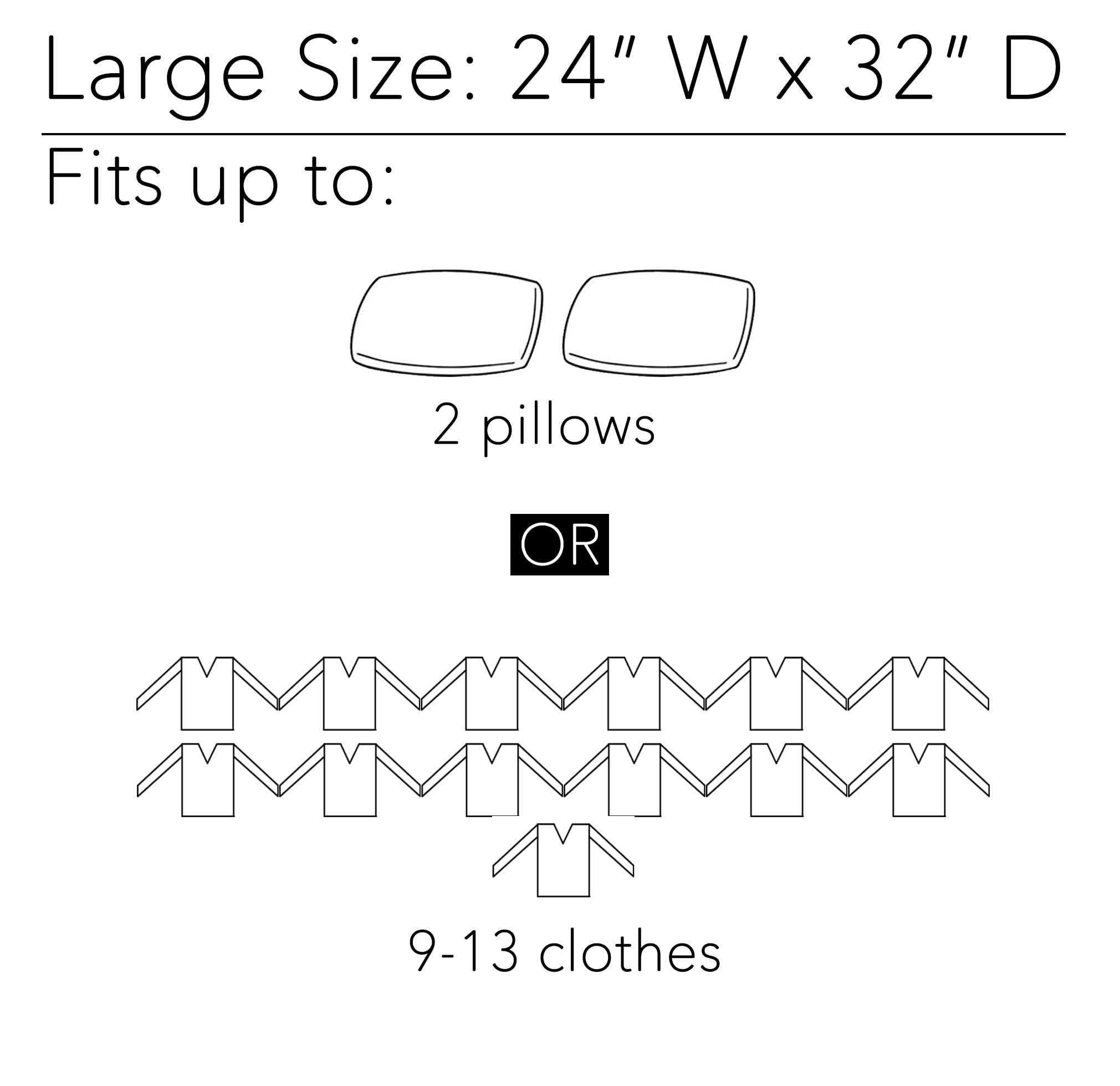 - 3 X-Large bags: Each bag measuring 27.5” W x 39.5” D (70cm W x 100cm D), that’s big enough for 4 standard pillows, 1 full/twin/queen bedding set