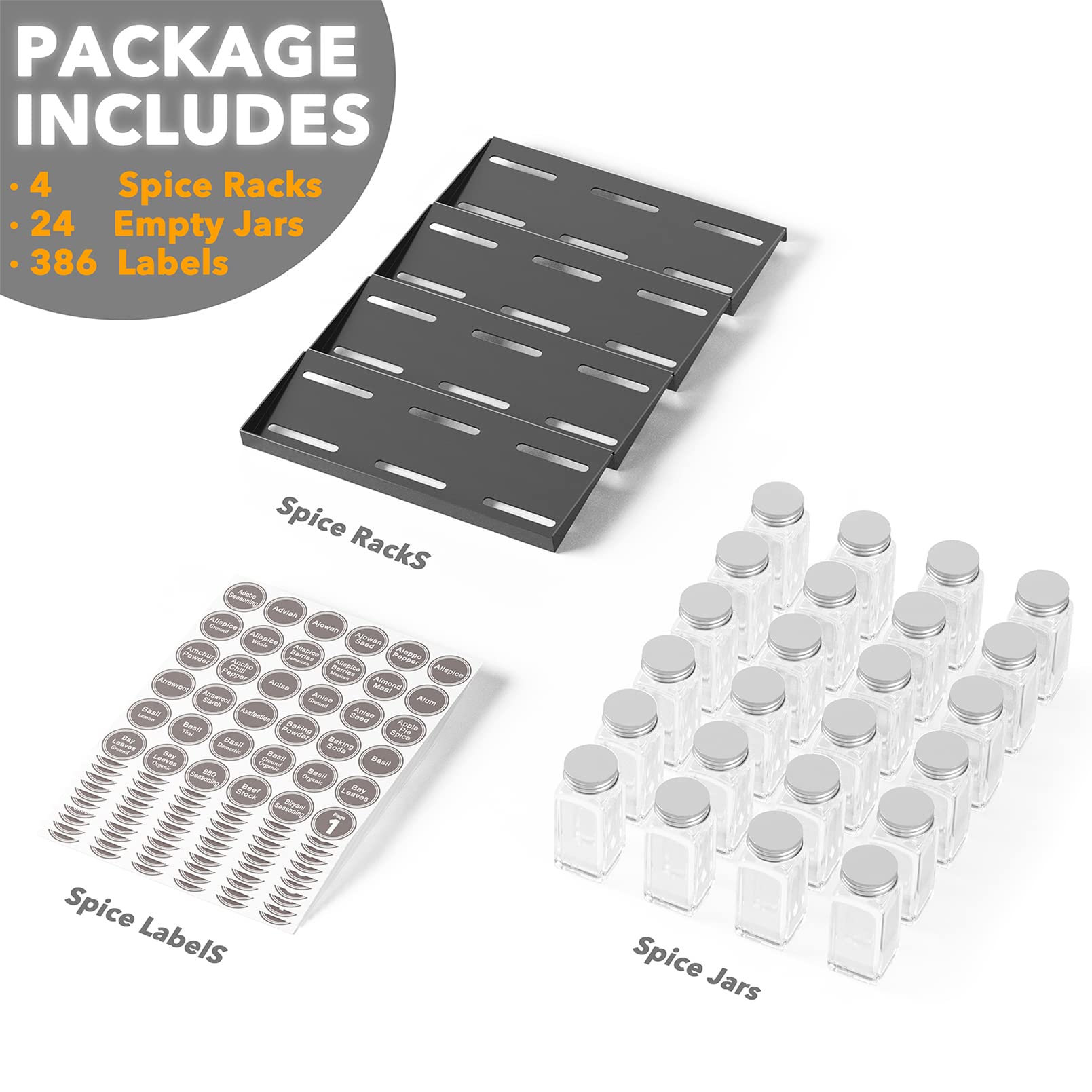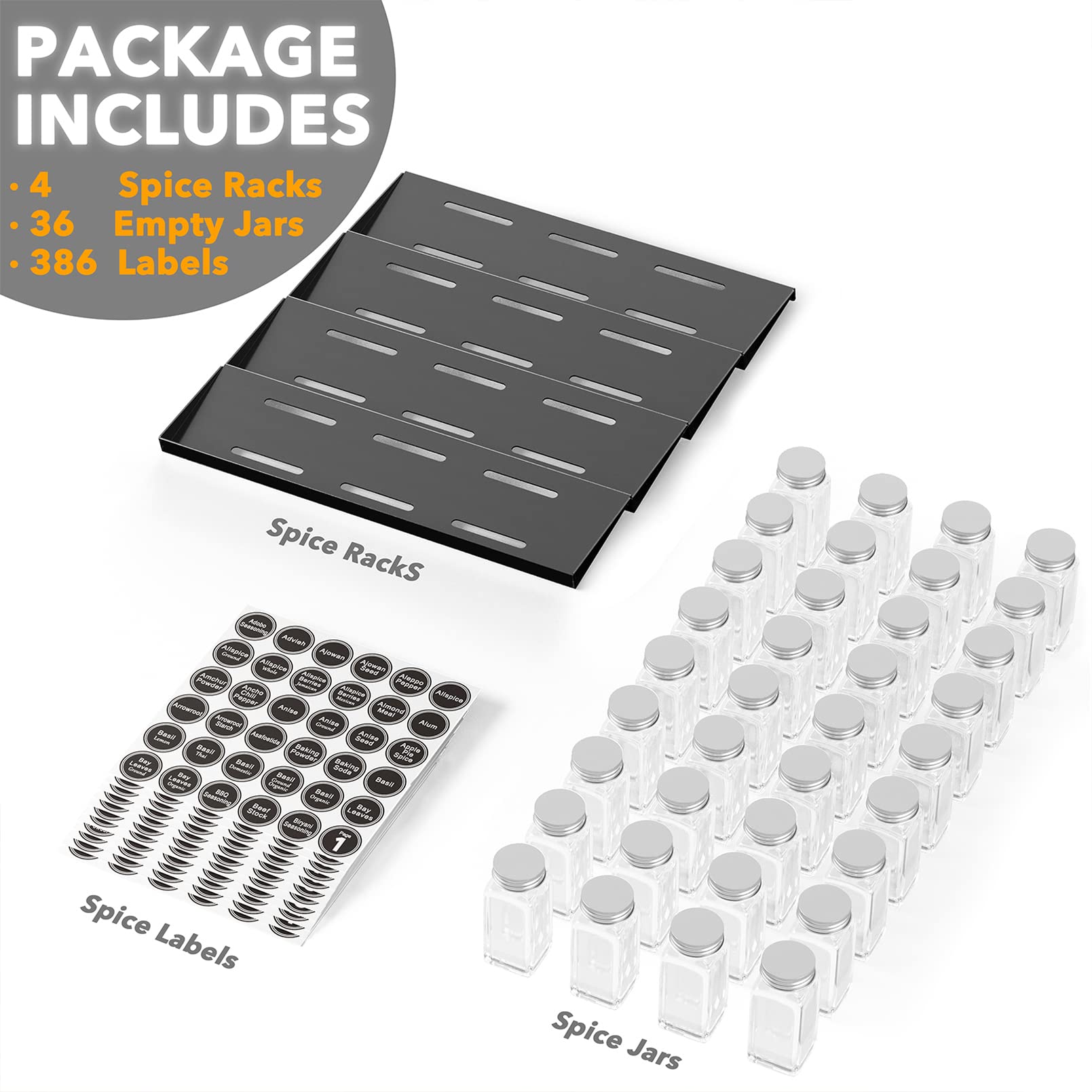 • Complete Drawer Spice Organizer Set: 1 x Drawer Spice Rack, 28 x Square Empty Glass Spice Jars, 386 Spice labels; SIZE: 13"W x 17.5"D x 2.5"H