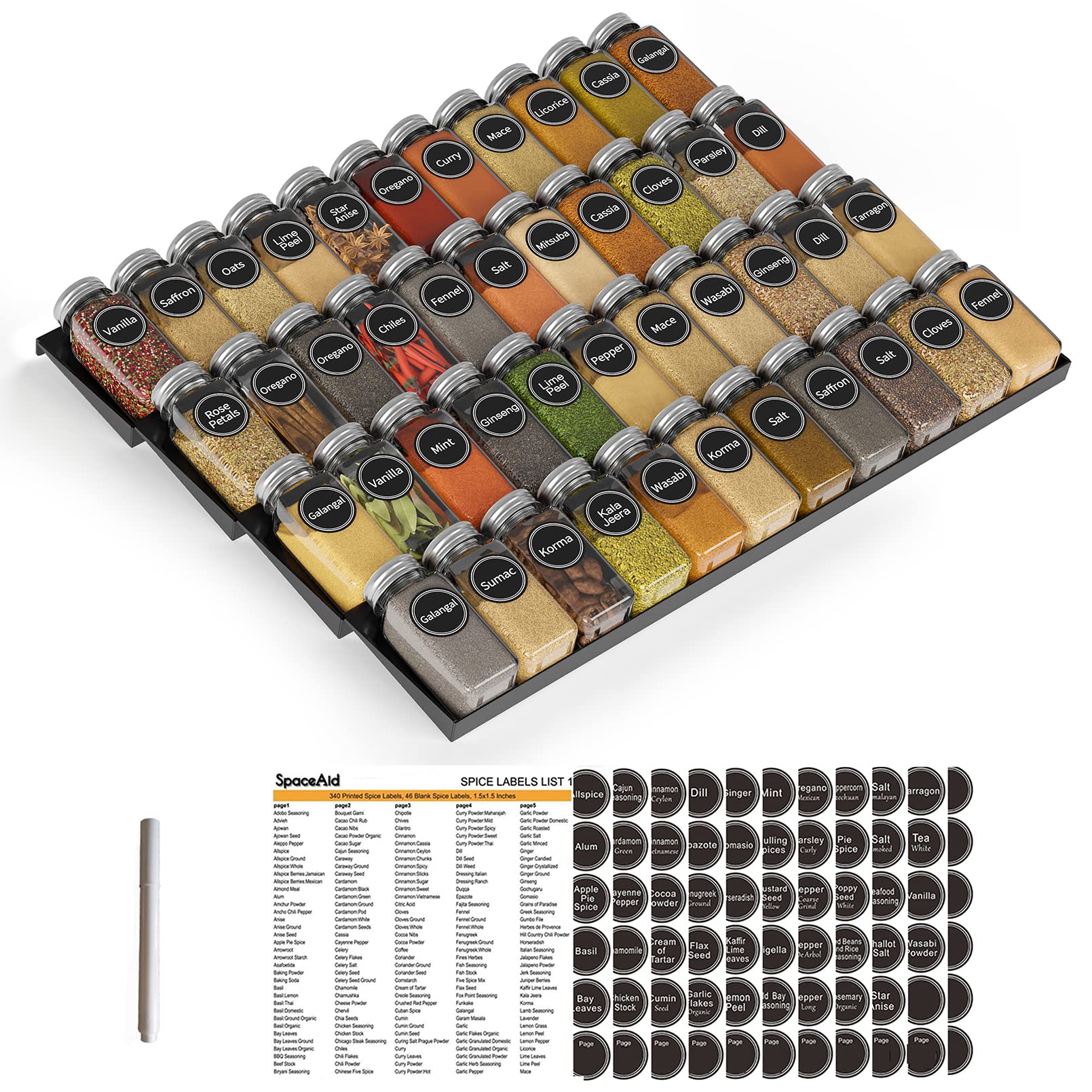 SpaceAid Spice Drawer Organizer with 28 Spice Jars, 386 Spice Labels, 4 Tier Seasoning Rack Tray Insert for Kitchen Drawers, 13" Wide x 17.5" Deep