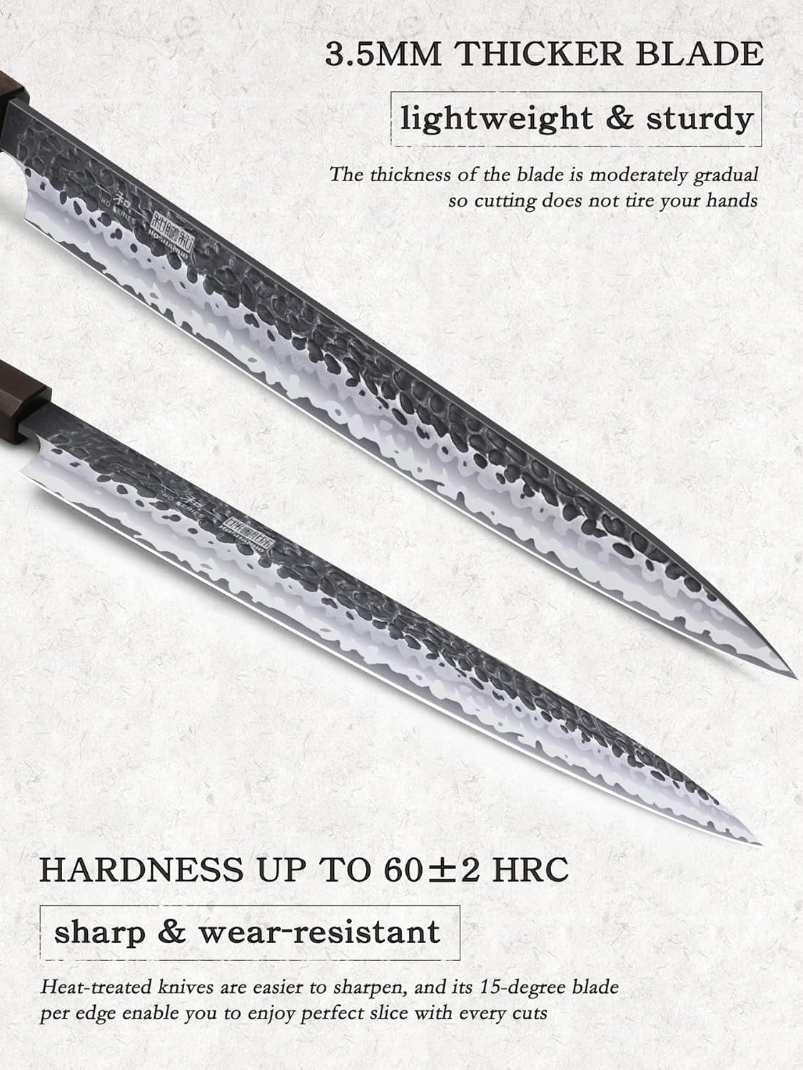 - 【Exceptional Sharpness】After multiple manual finishing processes, sashimi knife has a hand polished edge of 12-15 degrees per side and rockwell hardness: 60±2 HRC, which can achieve best sharpness and edge retention; Double bevel blade is strong and sharp for perfect cutting