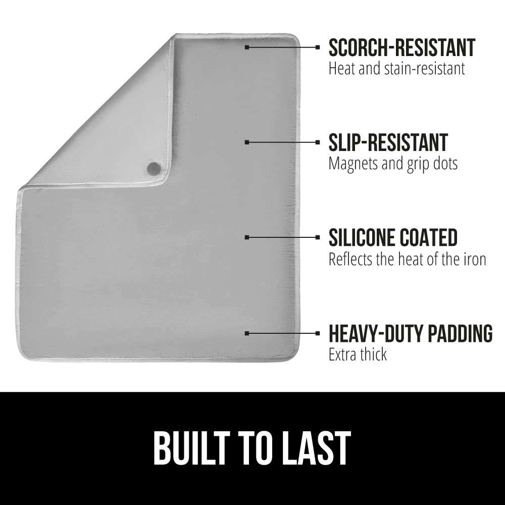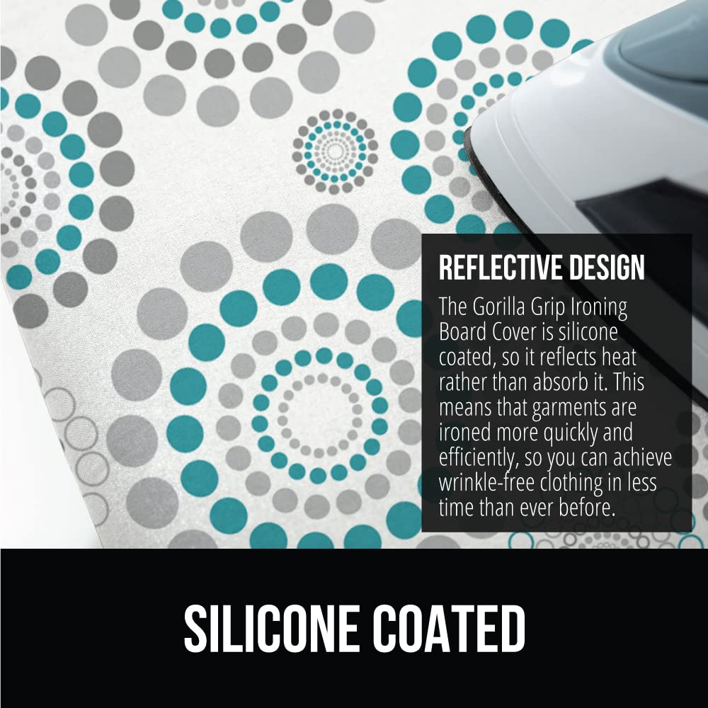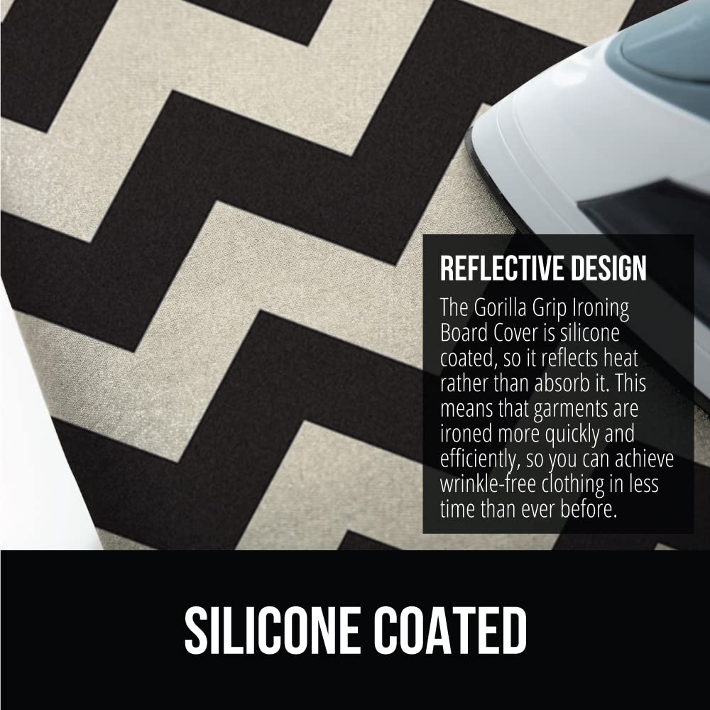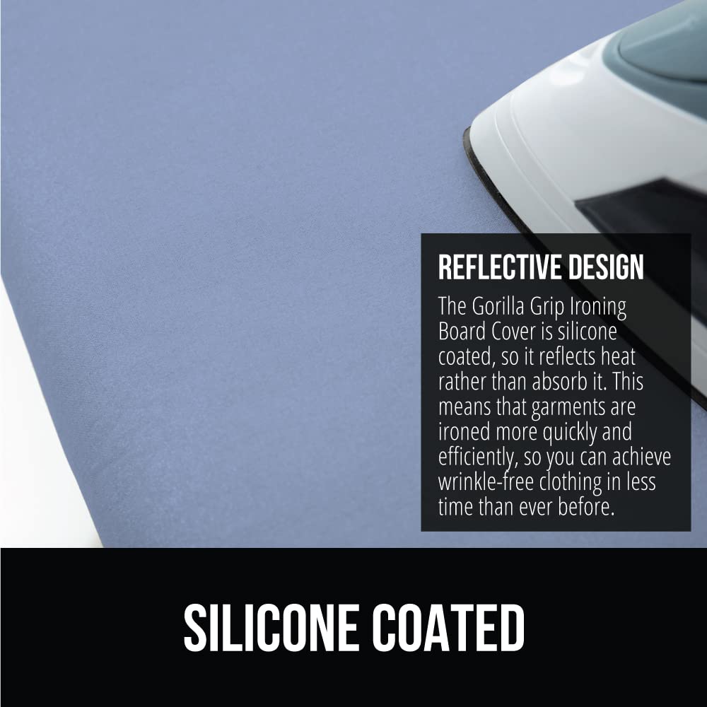 • REFLECTIVE SILICONE COATED: the silicone surface of the cover is reflective; while other materials absorb heat, silicone reflects the heat of the iron to help achieve wrinkle free clothes in a fraction of the time; plus, irons glide effortlessly for easy ironing every time