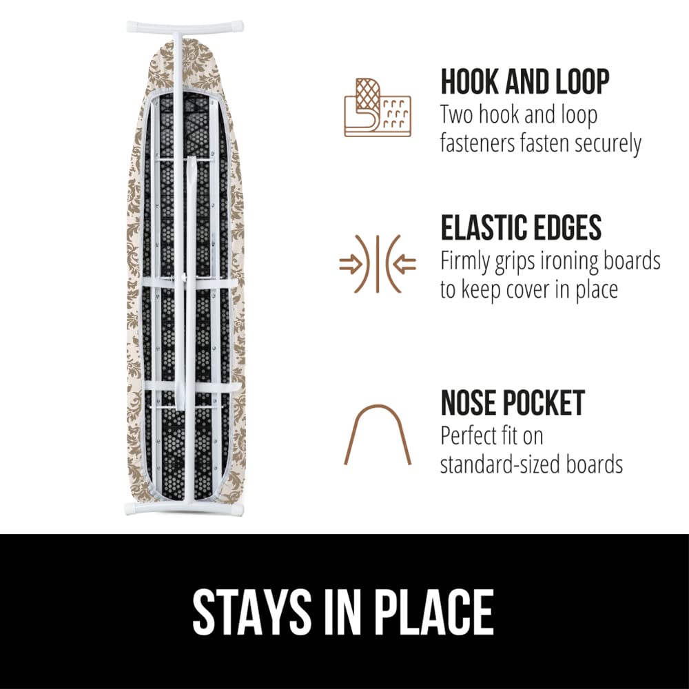 • FITS MOST BOARDS: the cover features a nose pocket design and measures 15 by 54 inches, so it’s designed to fit standard sized ironing boards; the elasticized edges create the look of a custom cover