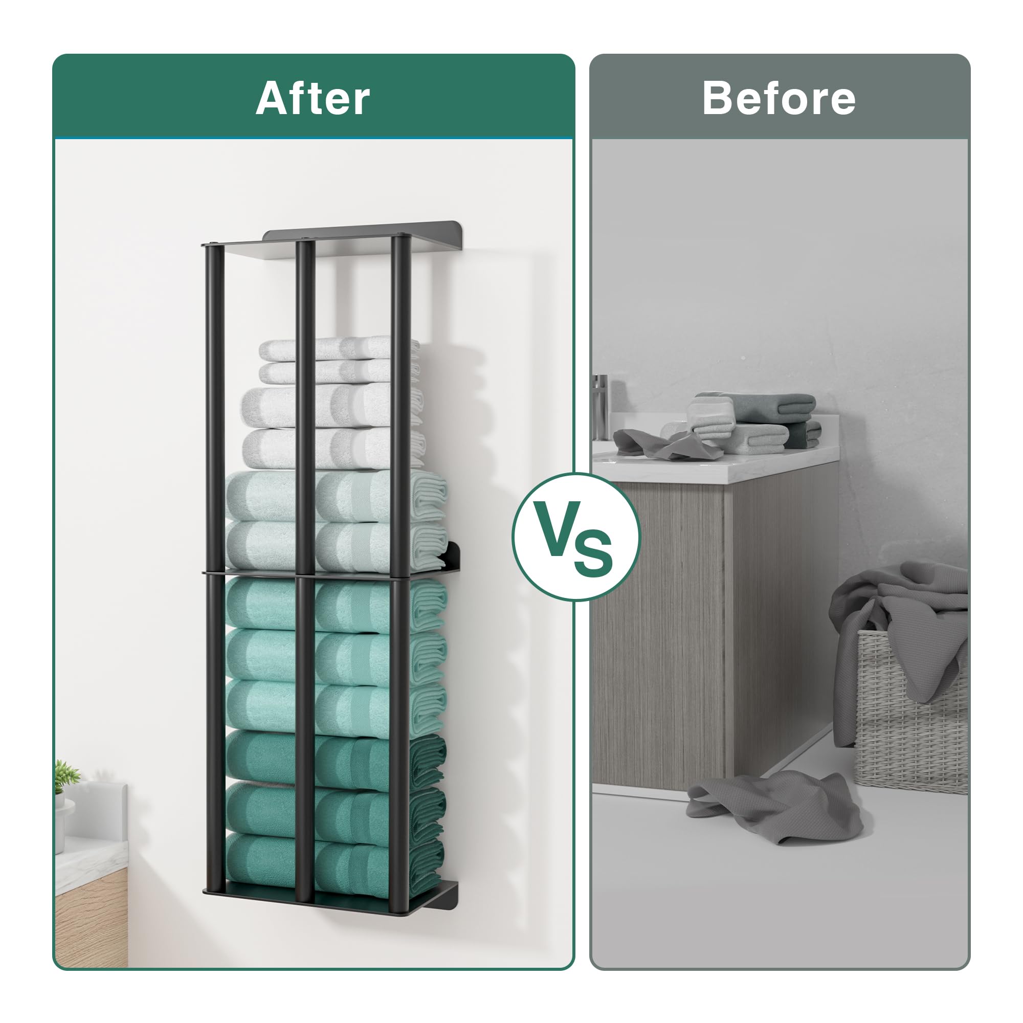 • Thoughtful design-This towel rack features shelves both above and below for preventing towels from falling and keeping them neatly organized. In addition, the top of the rack can be used to store small items, maximizing its utility and space-saving capabilities.
