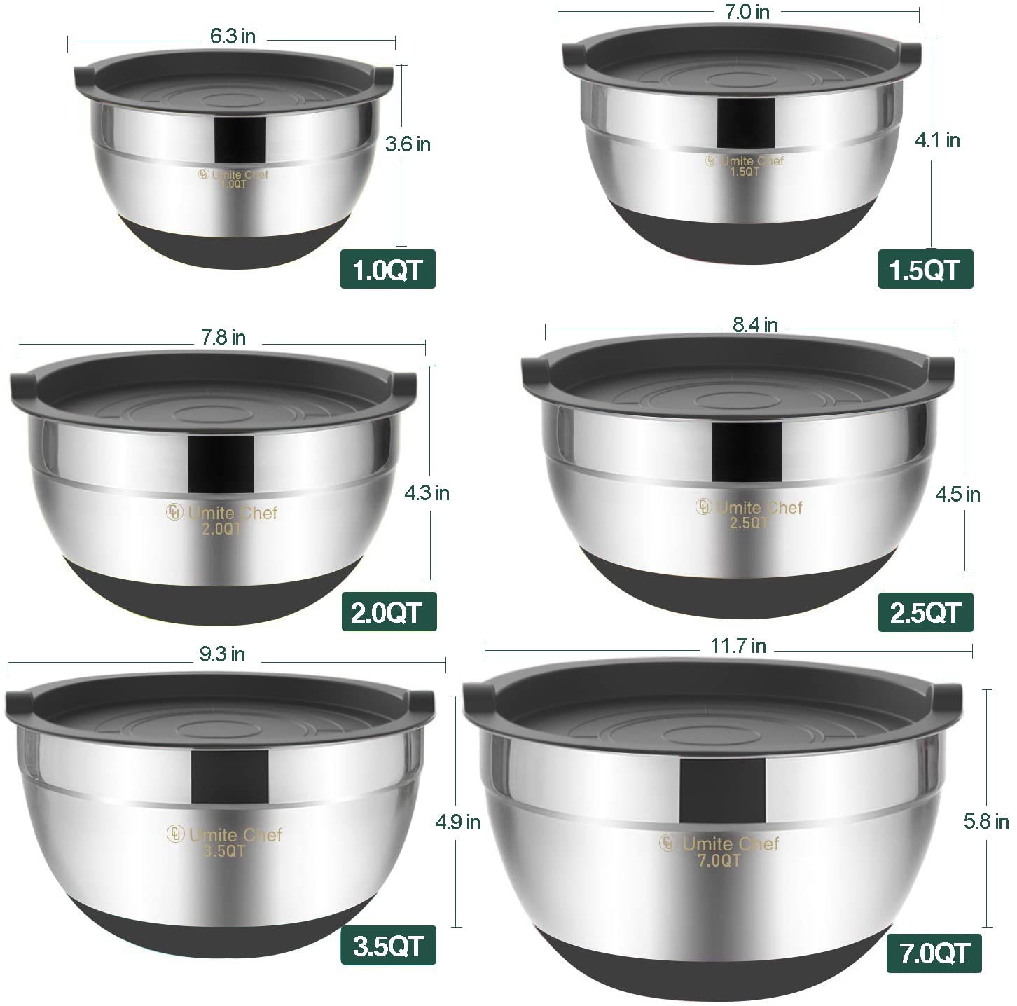 - PREMIUM MATERIAL: Each bowl is made of high-quality heavy gauge stainless steel, which is resistant and rustproof. Umite Chef mixing bowls feature a mirror finish interior and fingerprint-proofexterior. High-quality food grade stainless steel, you and your family can ues it with peace of mind