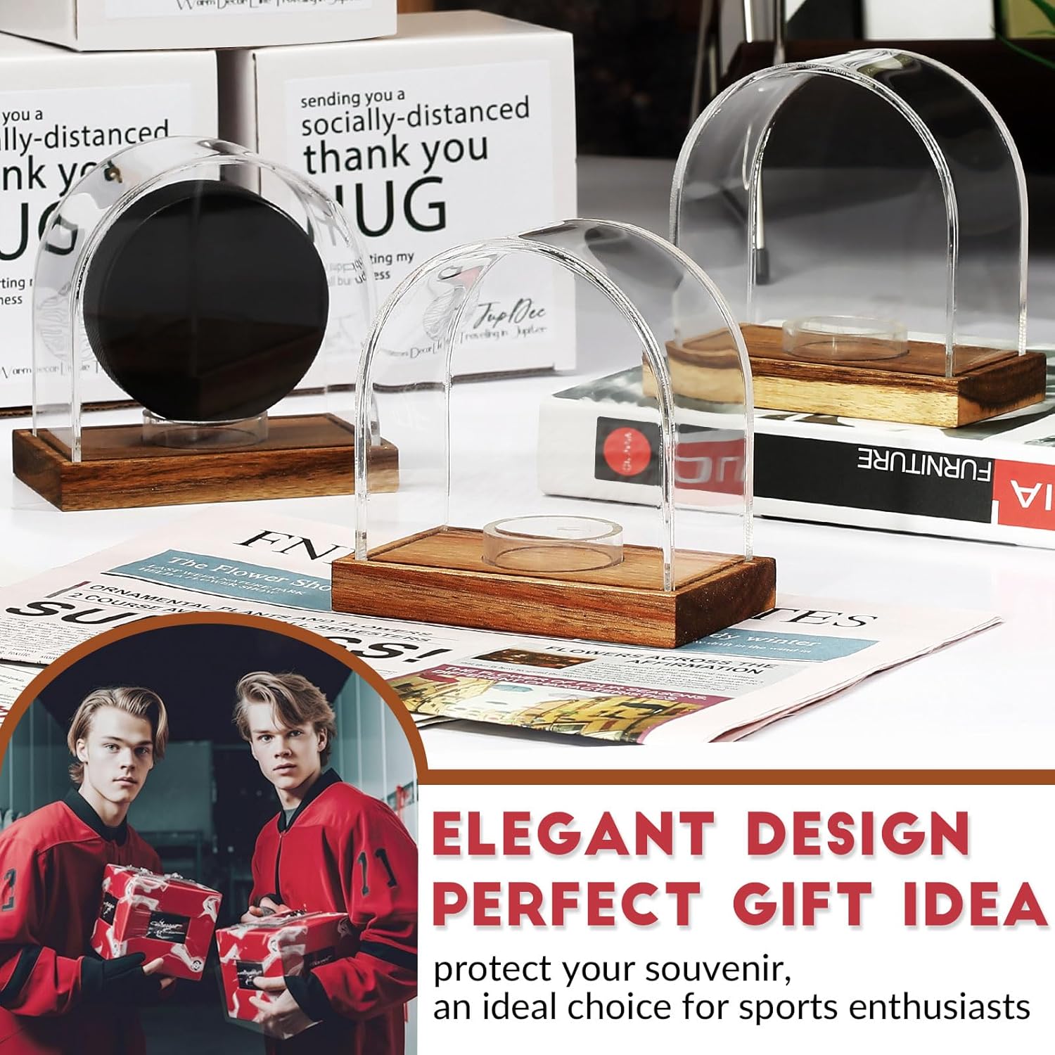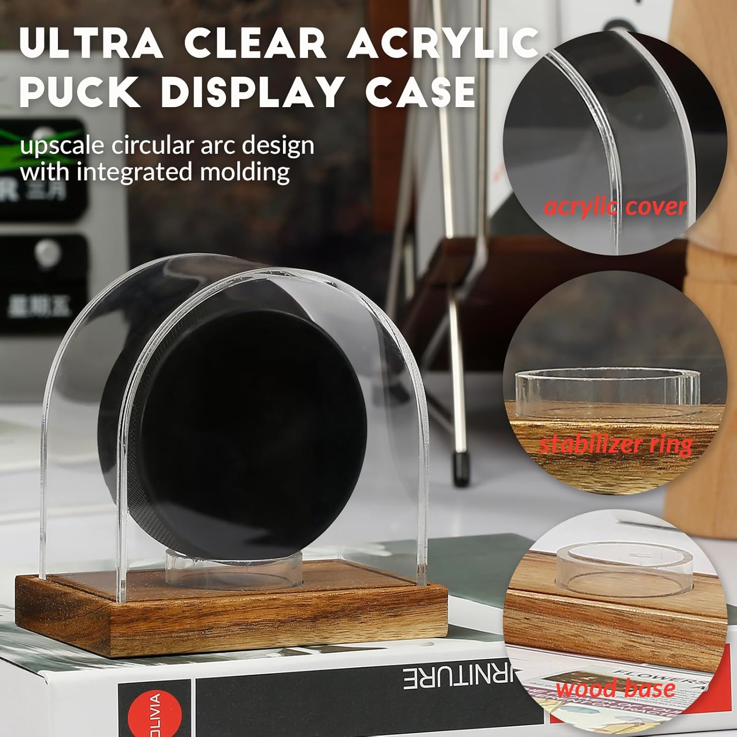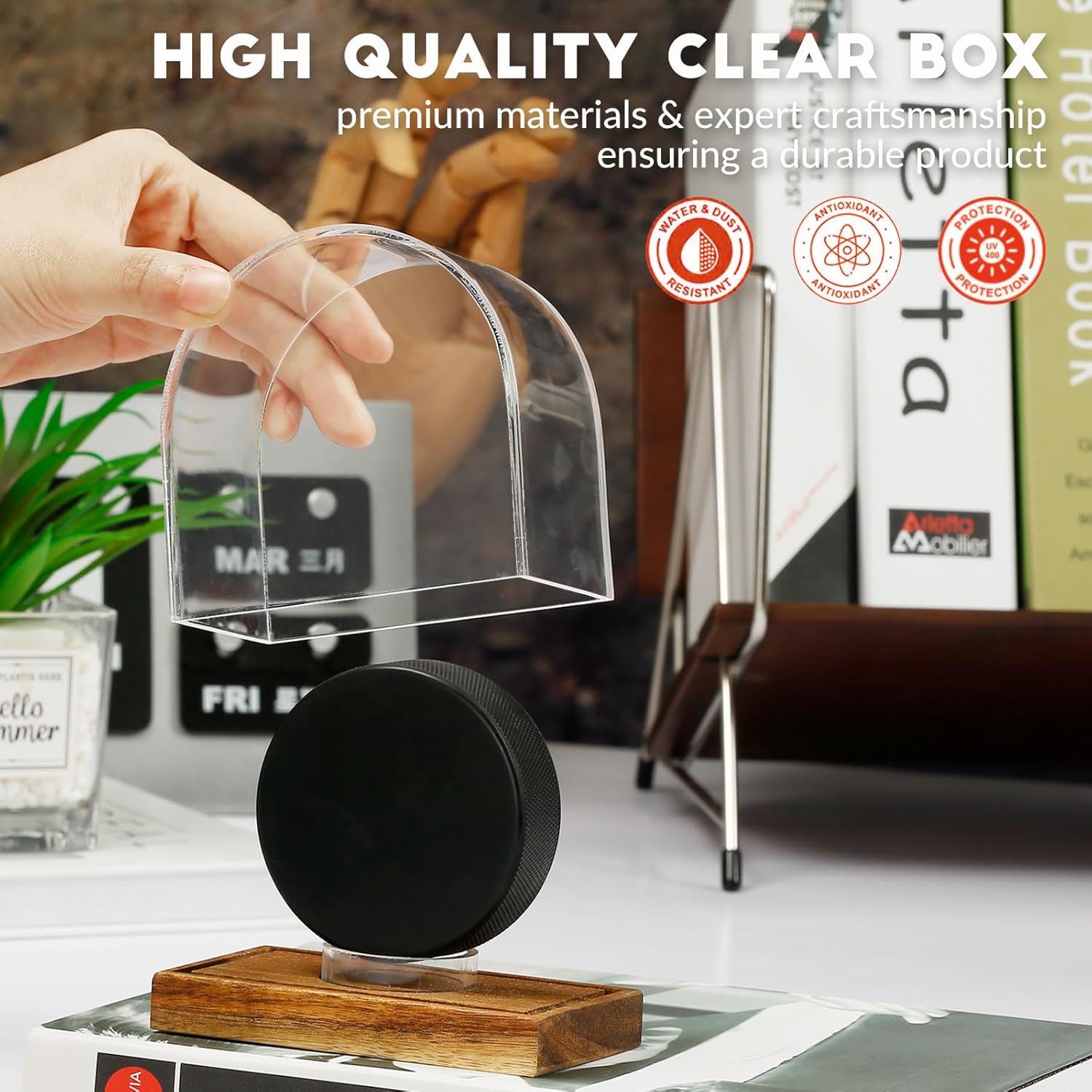 - Elegant Design - The curved thick acrylic box and rectangular mahogany base perfectly combine to present a pleasing display. The detachable circular support ring in the center not only provides a stable and adjustable position for ice hockey and collectibles, but also elegantly integrates into the overall design. At the same time, the rectangular rosewood base not only provides a stable foundation for display, but also gives your ice hockey pucks and collection a more exquisite presentation. The