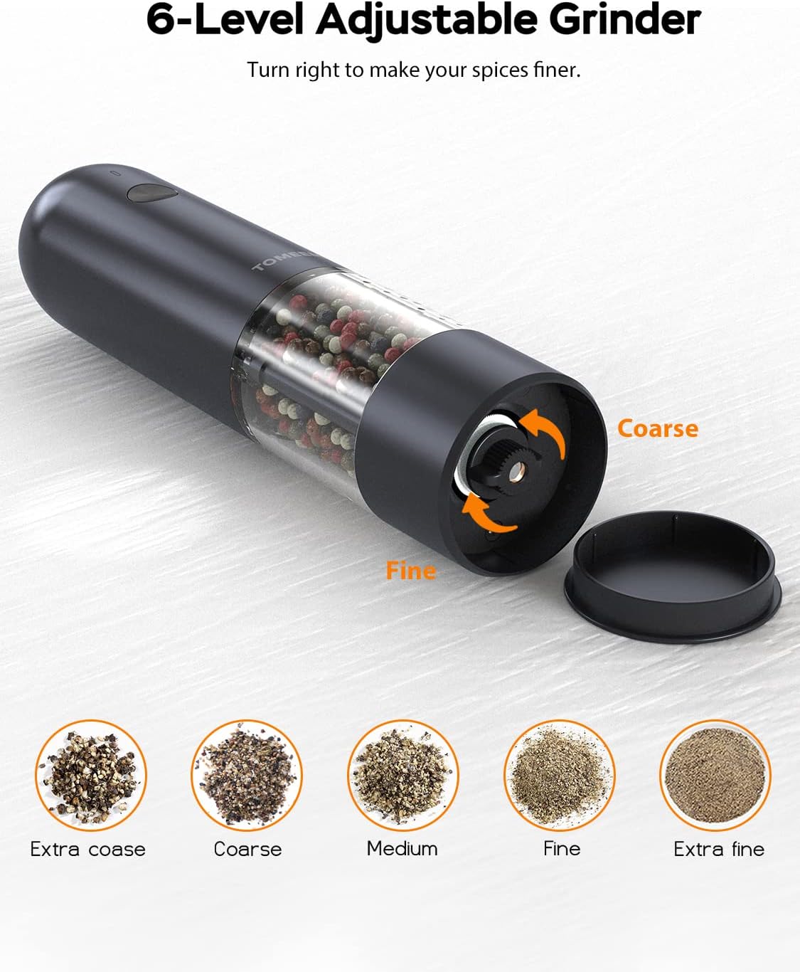 - 6-Level Adjustable Coarseness: Equipped with high hardness ceramic grinder, TOMEEM Electric Salt & Pepper Grinder Set is best choice for releasing the original aromas of the spices while grinding. 6 Coarseness settings are provided for kitchen lovers grinding spices from coarse to fine, meeting the vast majority of culinary needs