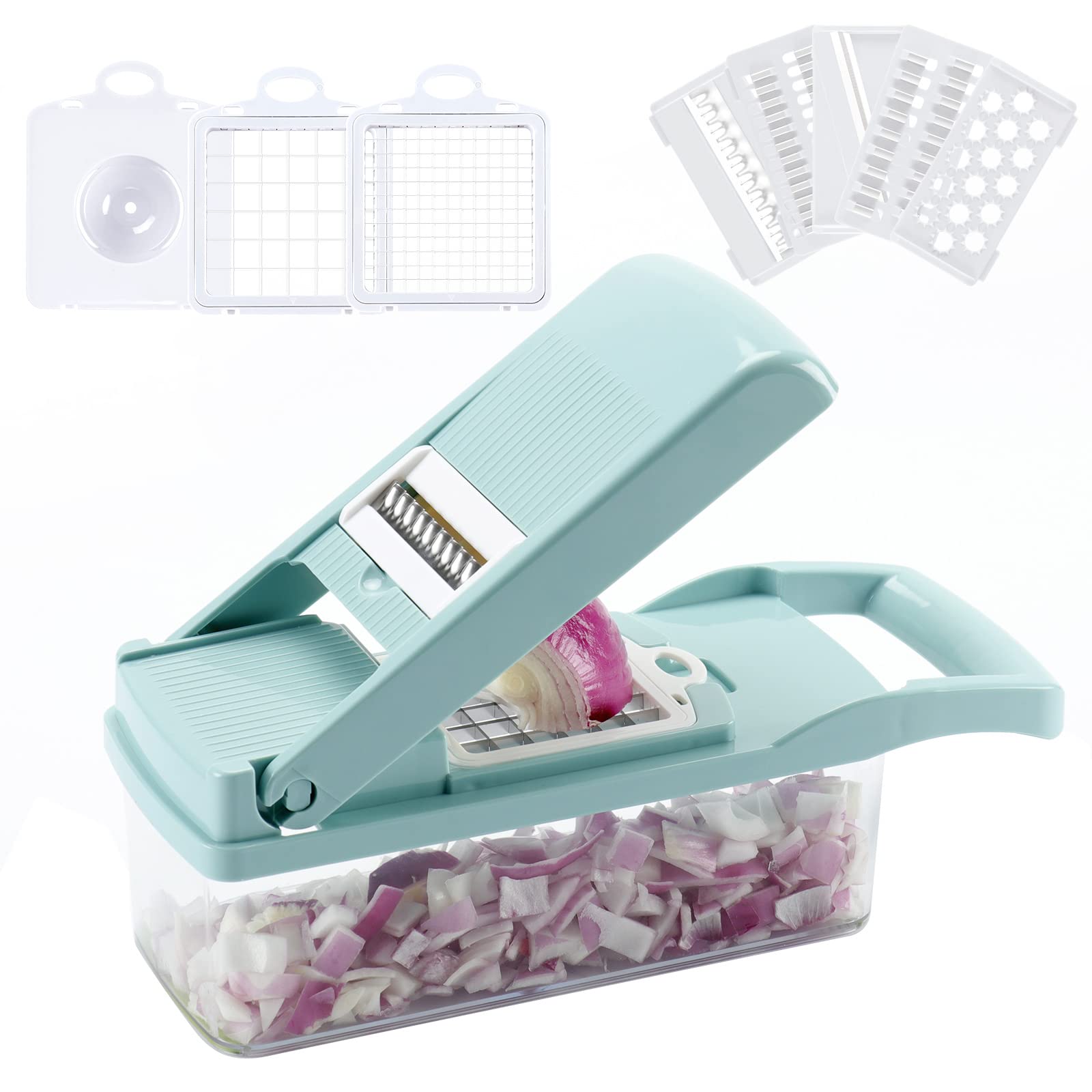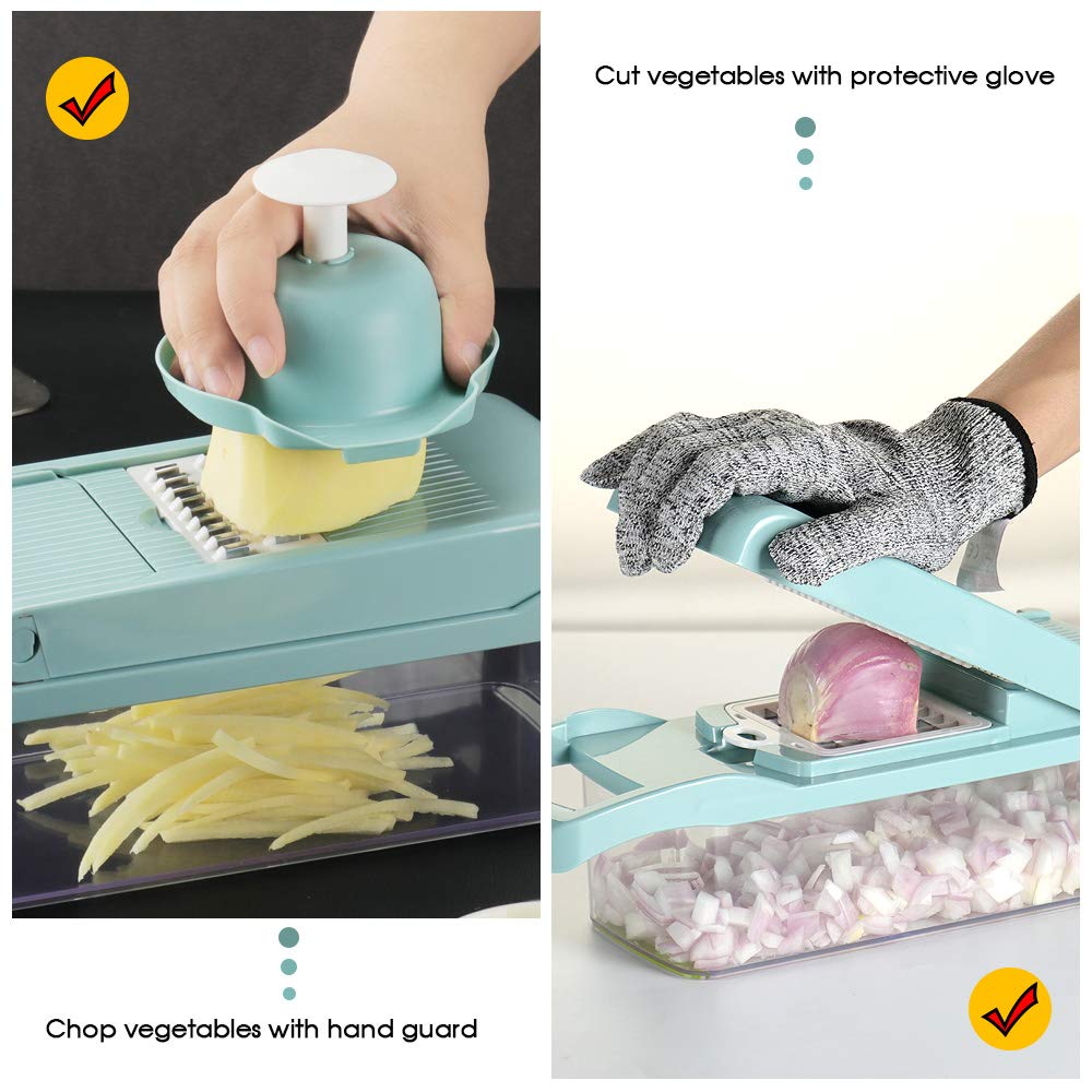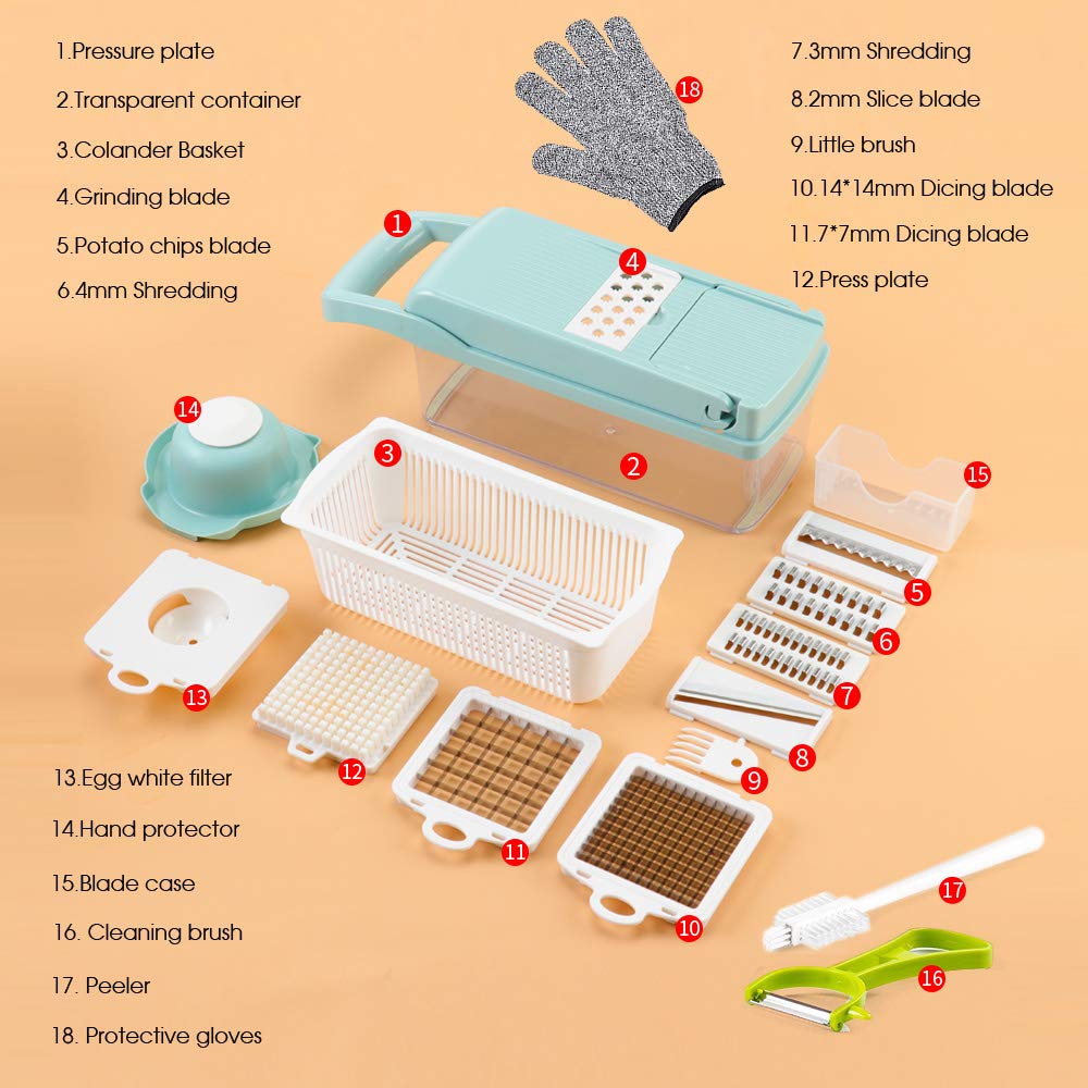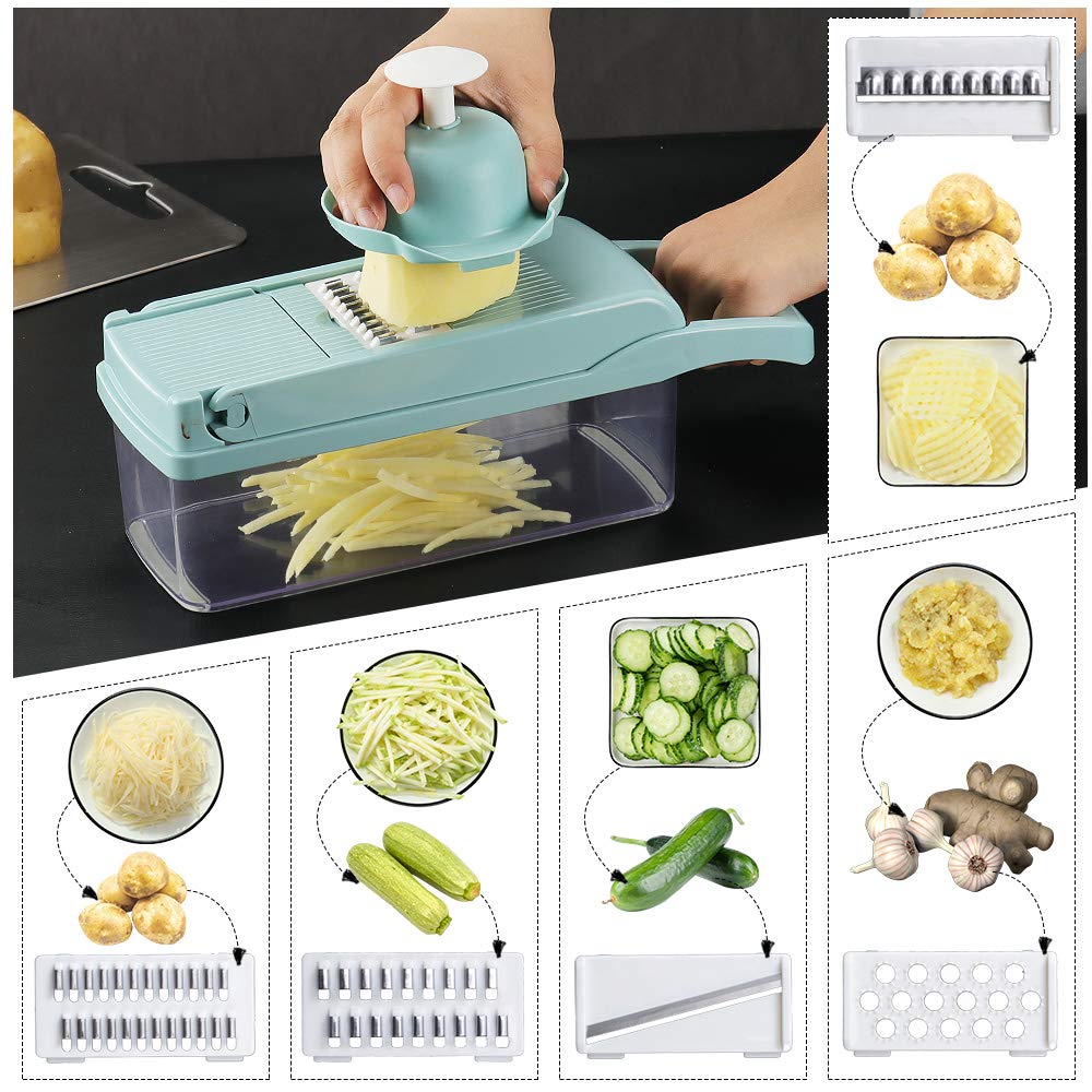 - Multifunctional Design: This vegetable chopper has 8 interchangeable blades for chopping, slicing, dicing, and pureeing a variety of foods.