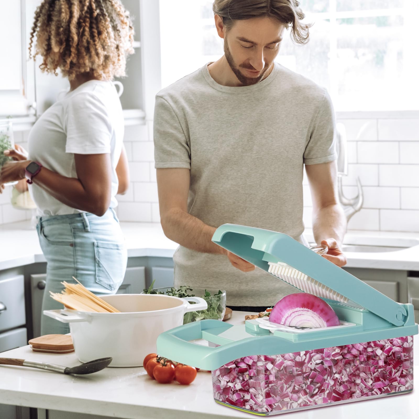 - Spacious Colander Basket: Includes a large colander basket to catch chopped produce and keep your countertop tidy.