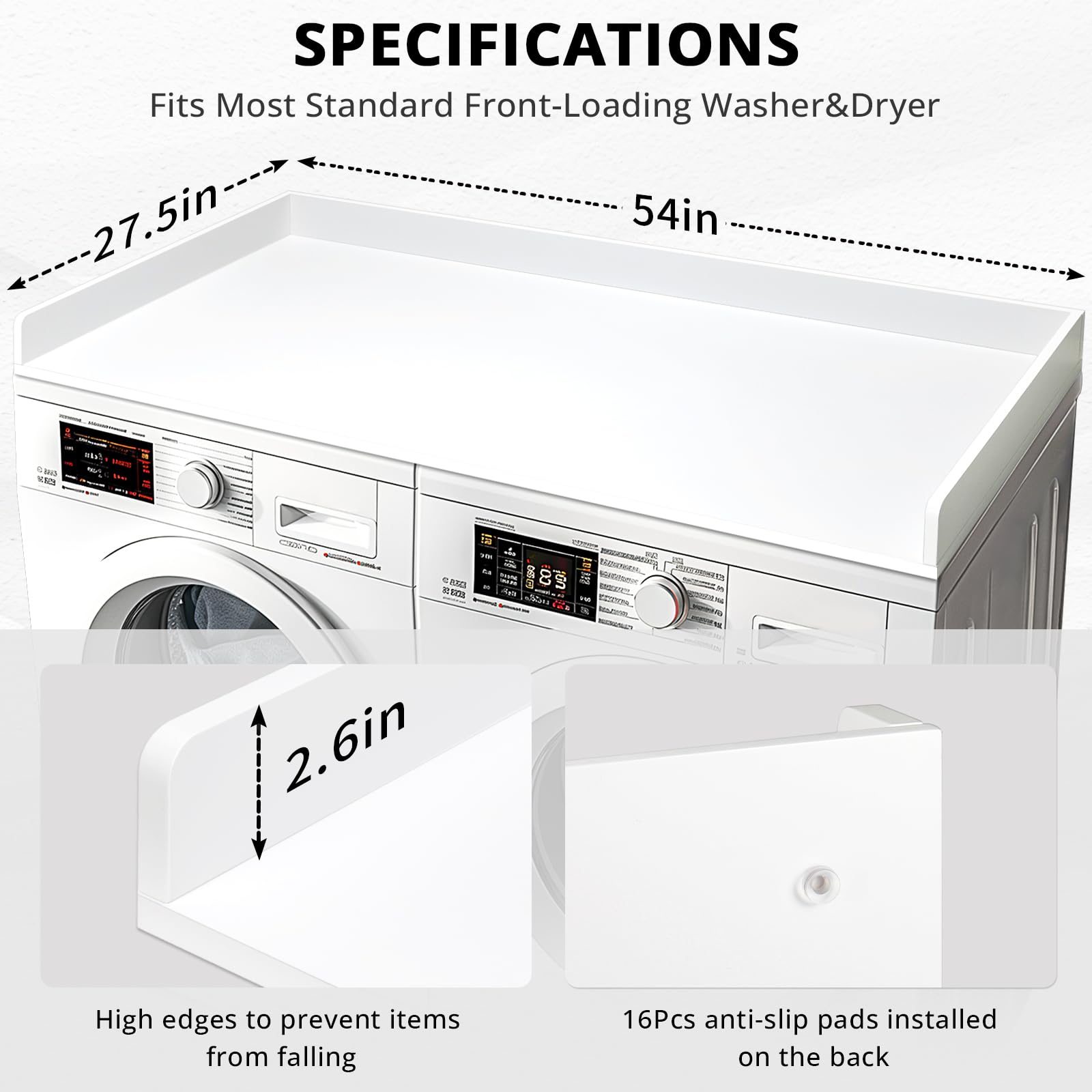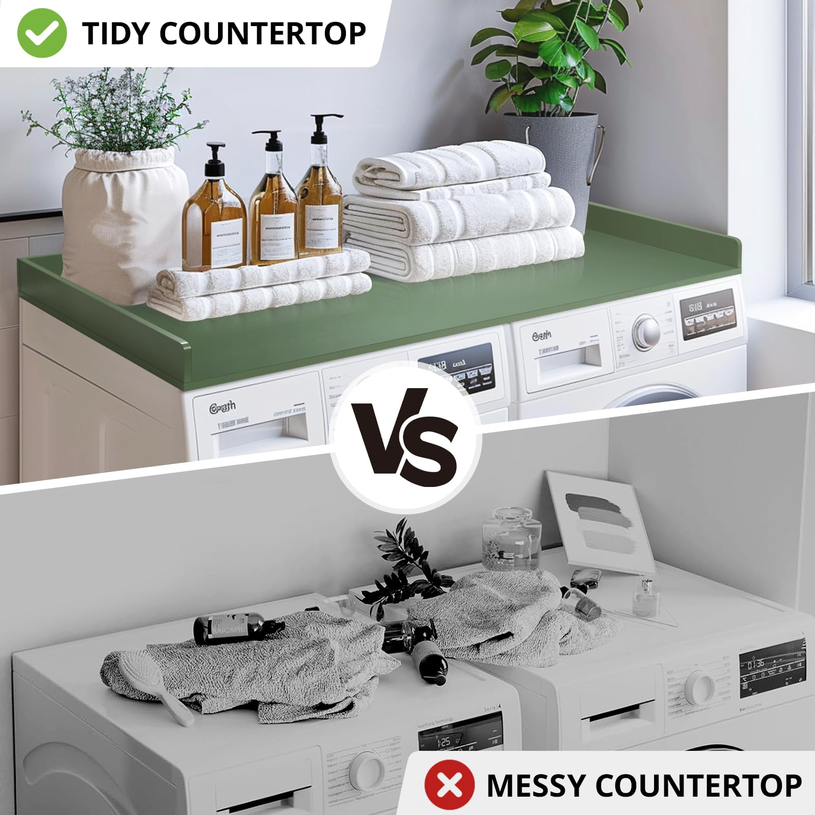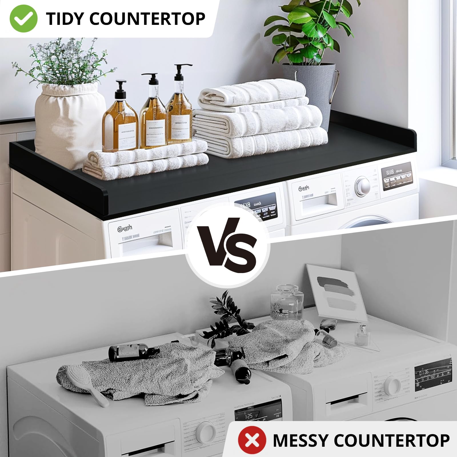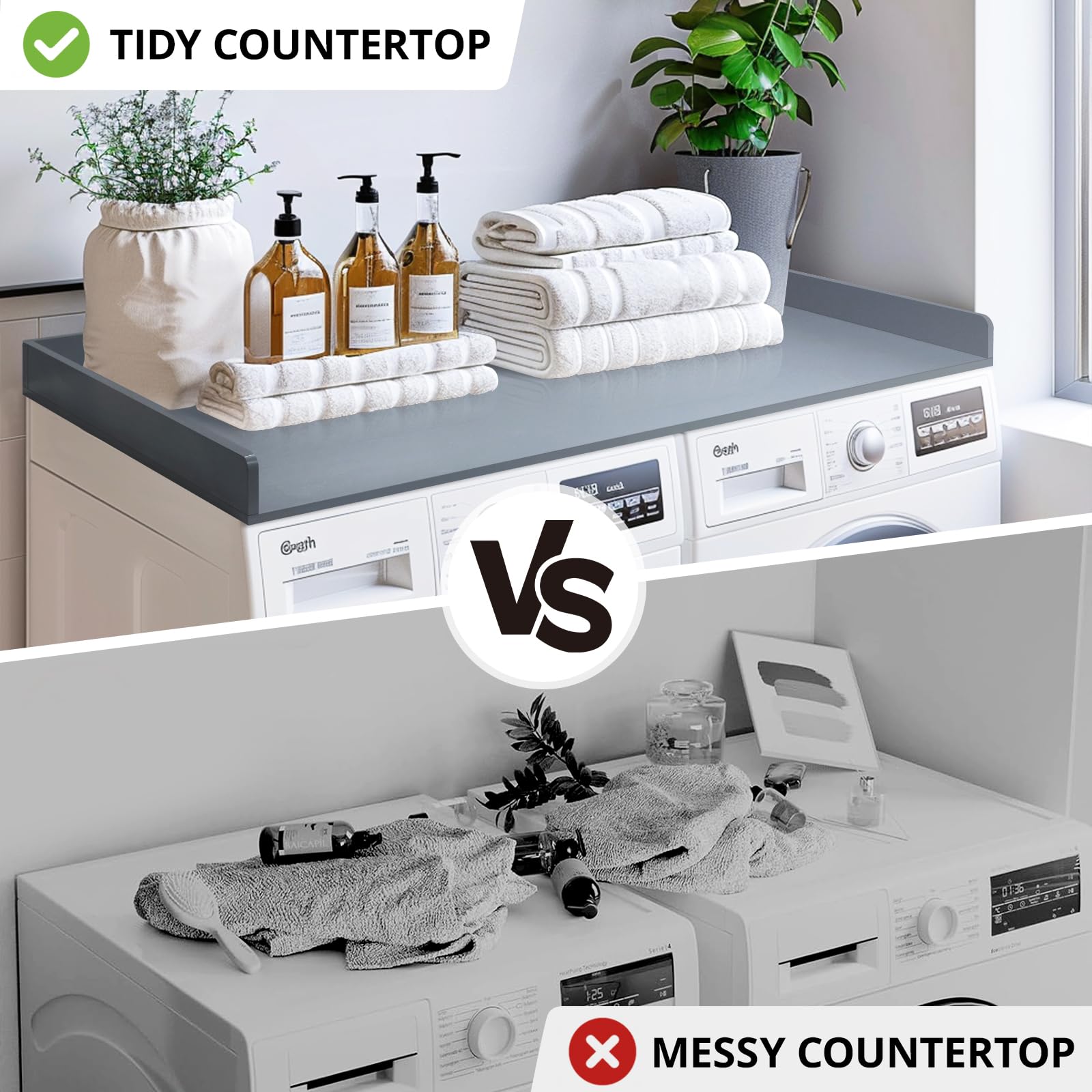 - Detail Design: The laundry countertop has raised edges to stop items from falling off. This modern design works with any laundry room organization style. and the laundry countertop include silicone non-slip pads on the bottom of the countertop, it can prevent laundry countertop from sliding around.