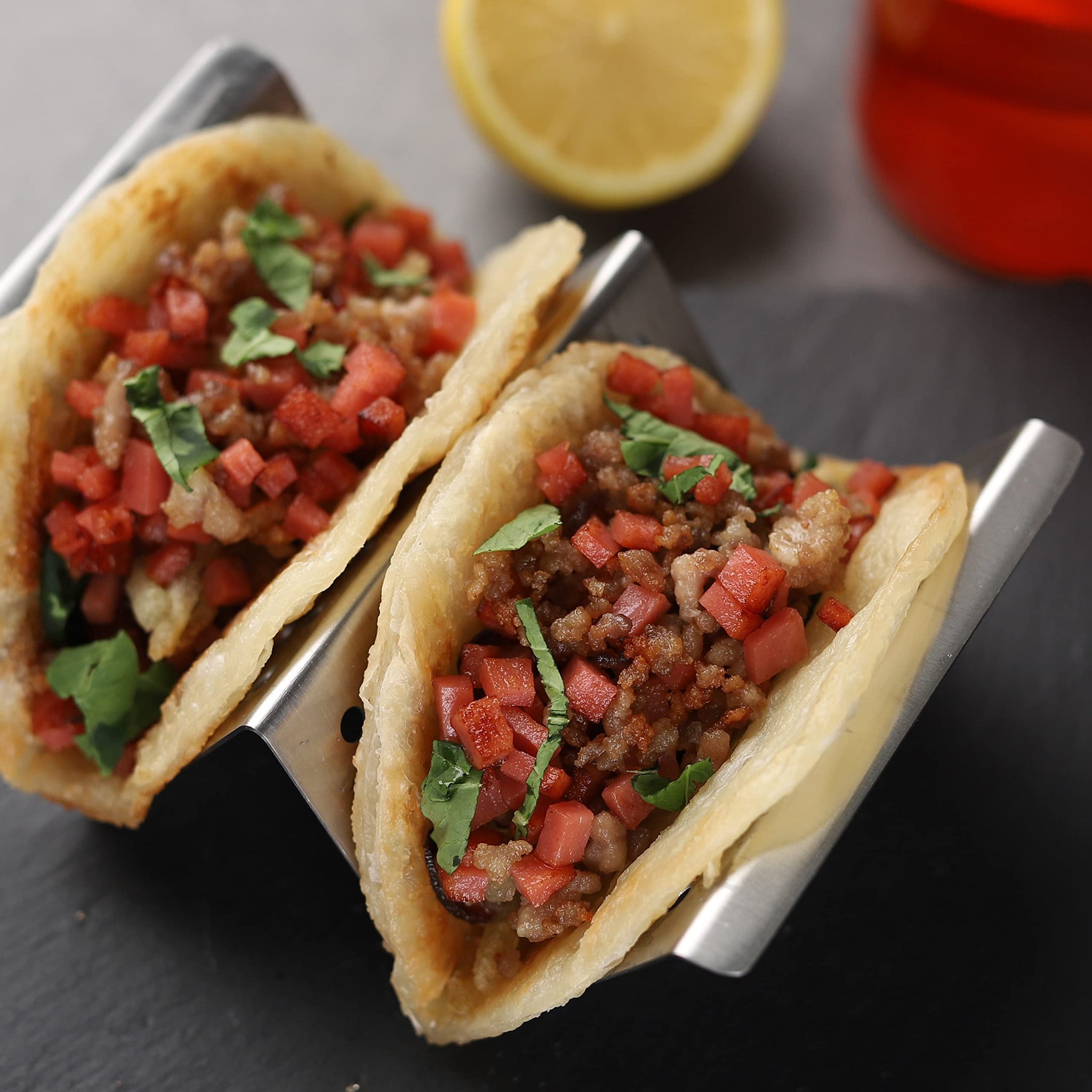 - The stainless steel taco stands can be used for hard and soft tacos, also for other wonderful delights such as sandwiches, waffles, hot dogs, sushi cone, sausage rolls and so more. These can be used for restaurnats and home well.