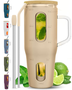 fullstar Glass Cups with Lids and Straws - Drinking Glasses, Glass Tumbler with Straw and Lid, Iced Coffee Cup with Bamboo Lids (Nude, 1 Pack)